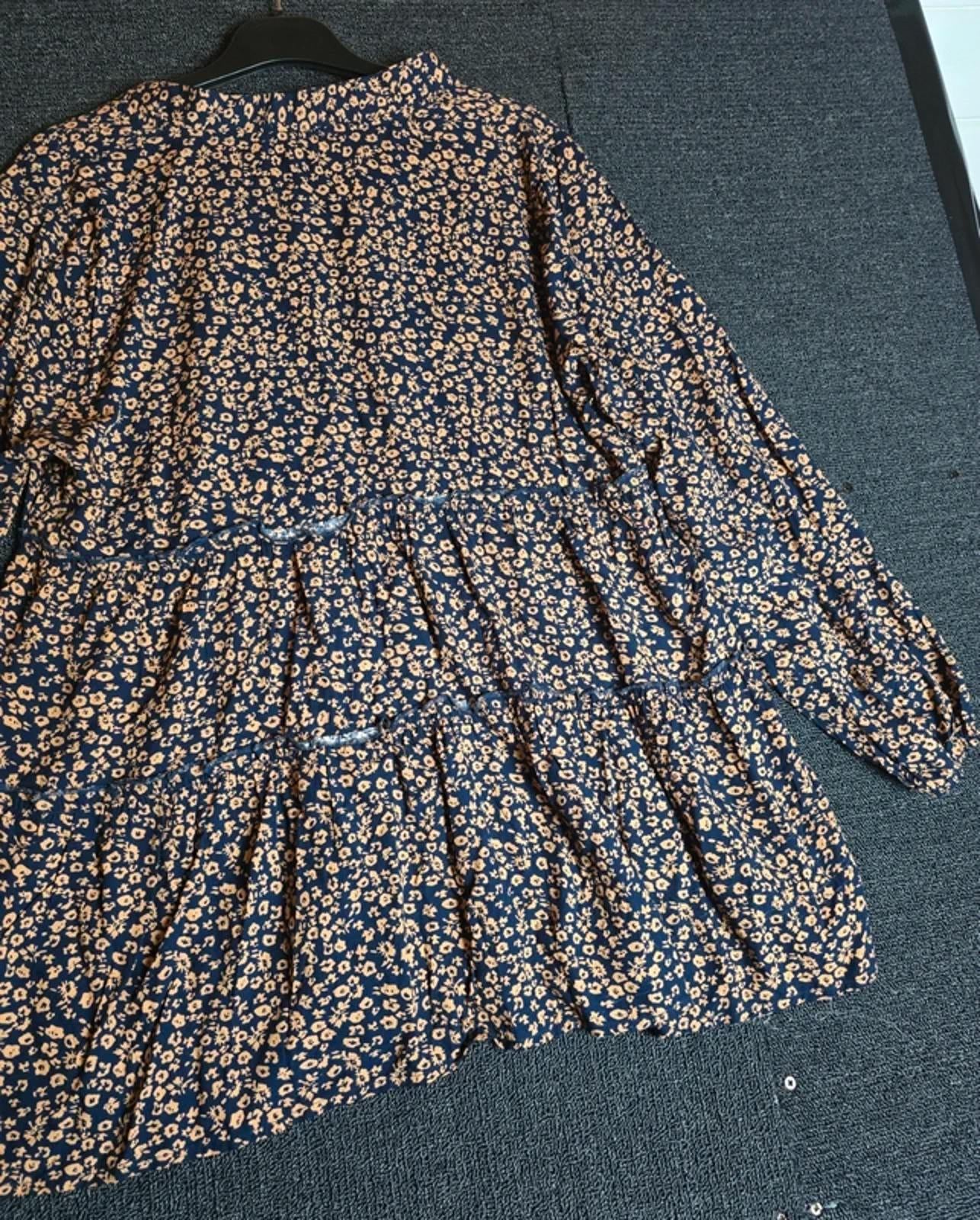 Preloved oversized smock blouse in a striking black and burnt orange floral print, ideal for casual daywear, work, or autumn styling. This feminine top features a relaxed, tiered frilly design that offers a comfortable and flowy silhouette.