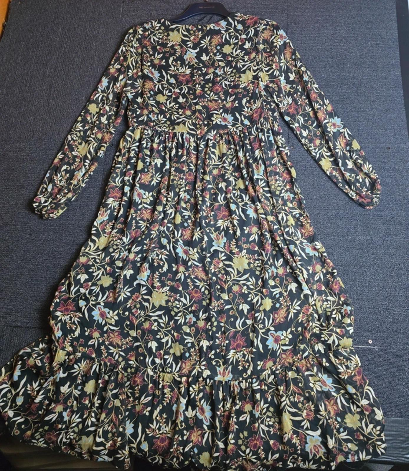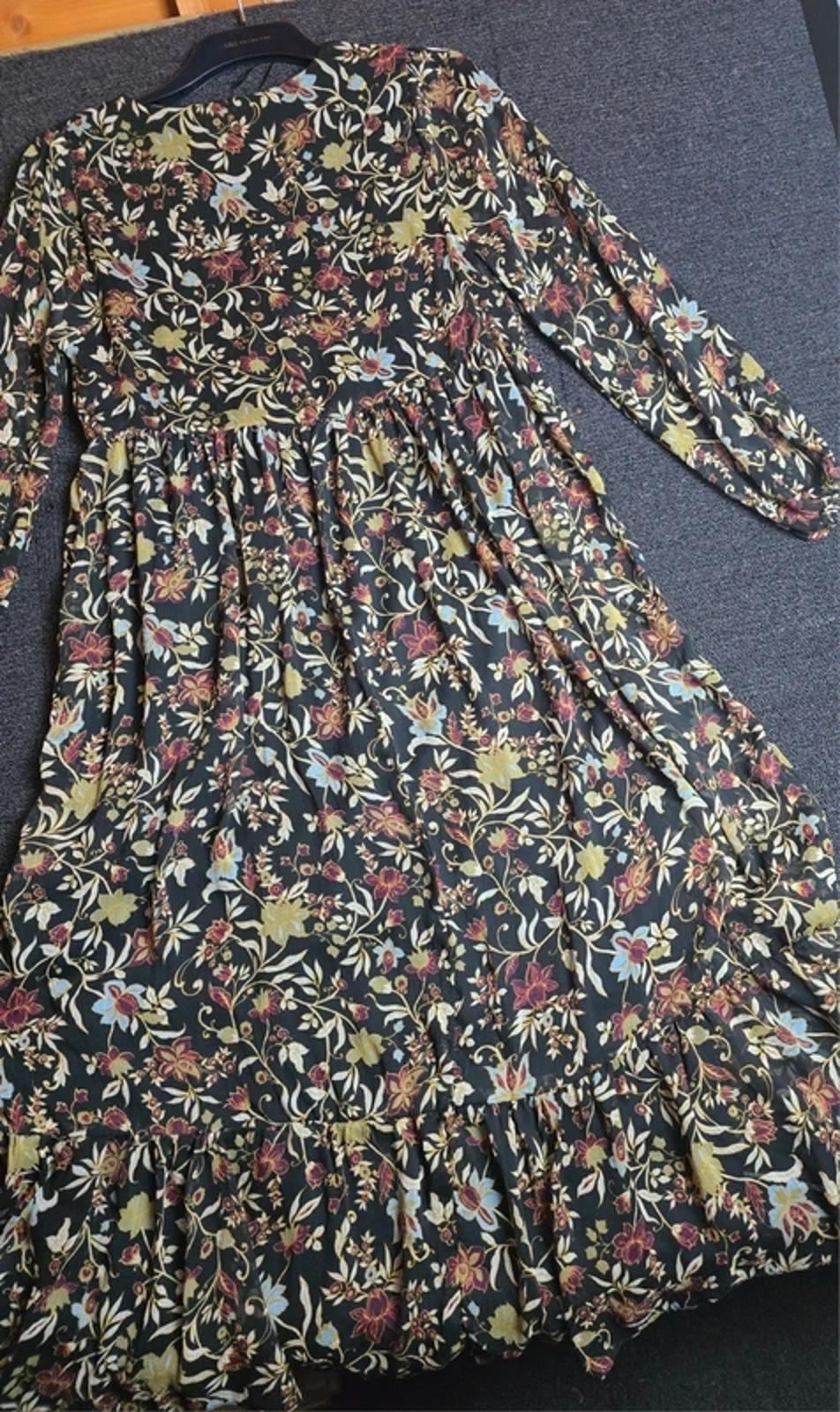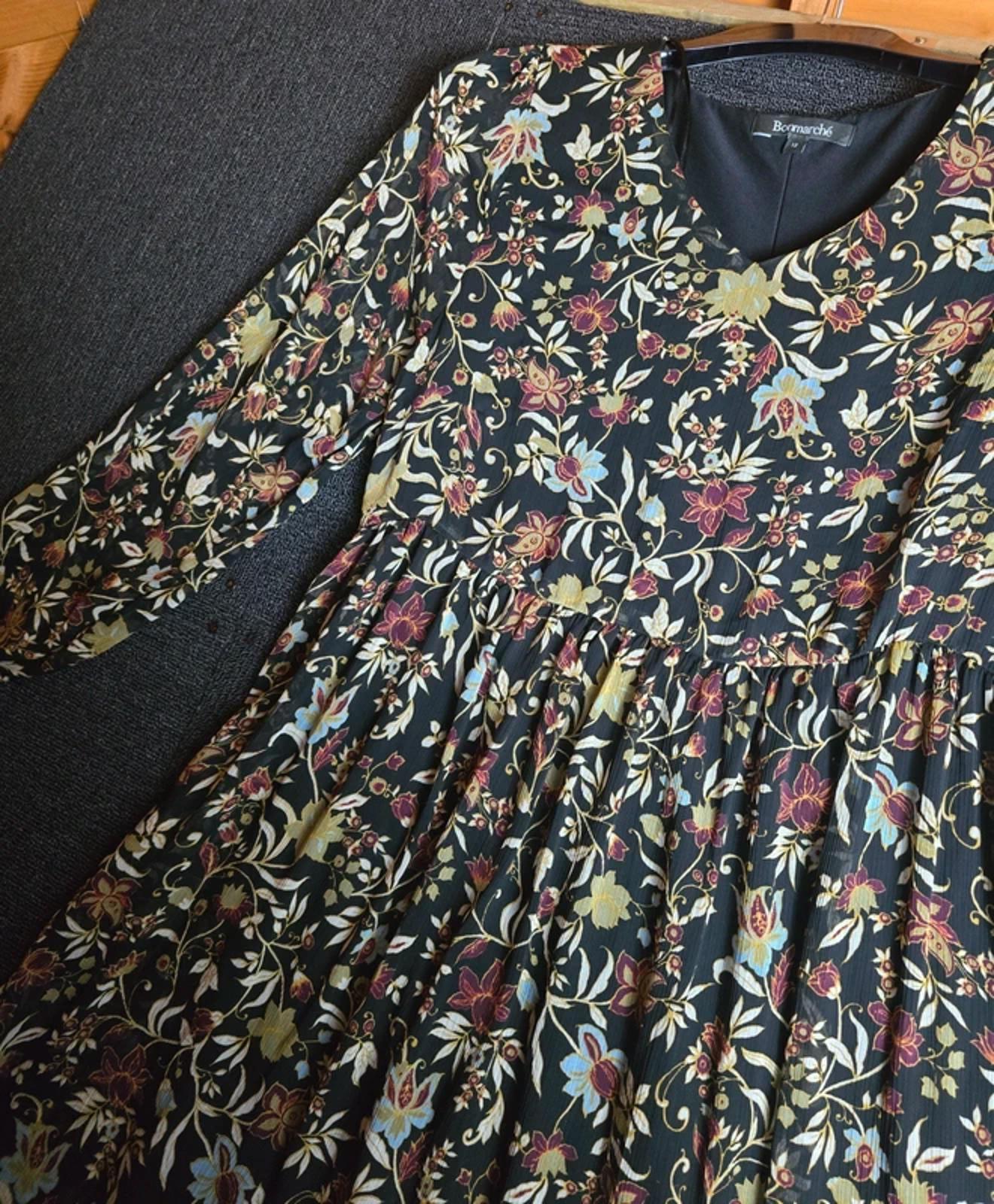 Preloved floral midi dress in black with multicoloured floral print, ideal for everyday wear, occasions, or smart-casual styling.