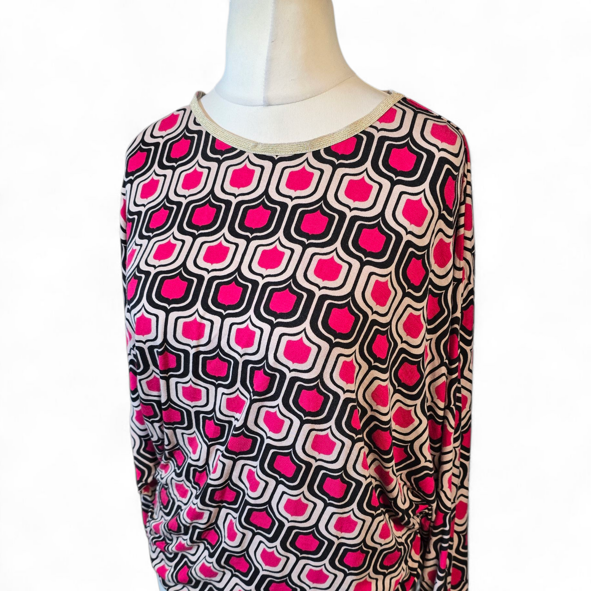 Bonmarché Pink, Black & Beige Patterned Top – Gold Trim, Batwing Sleeves – Size 12