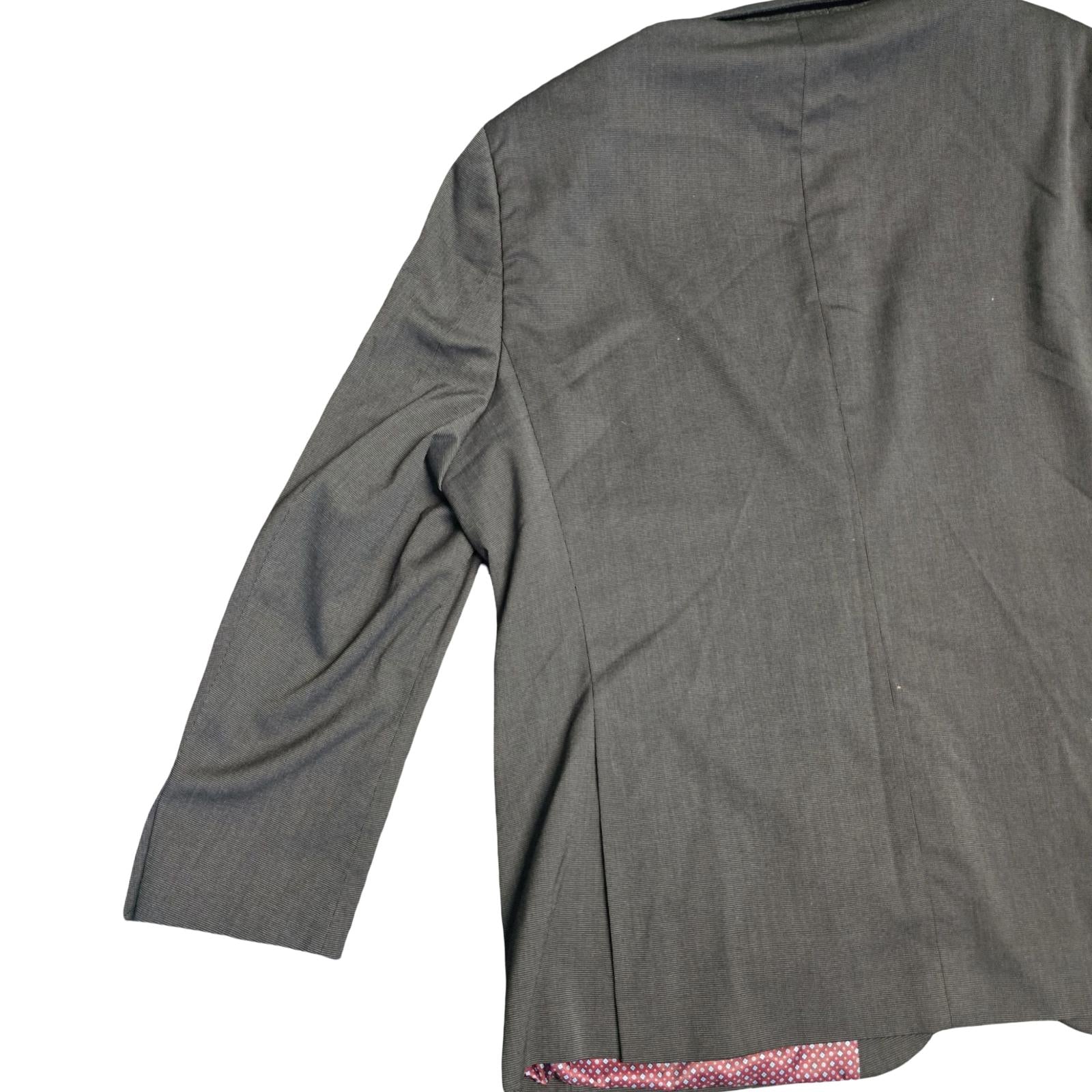 Style / Fit: Grey with a textured weave, Single breasted, two button close, Lined in red