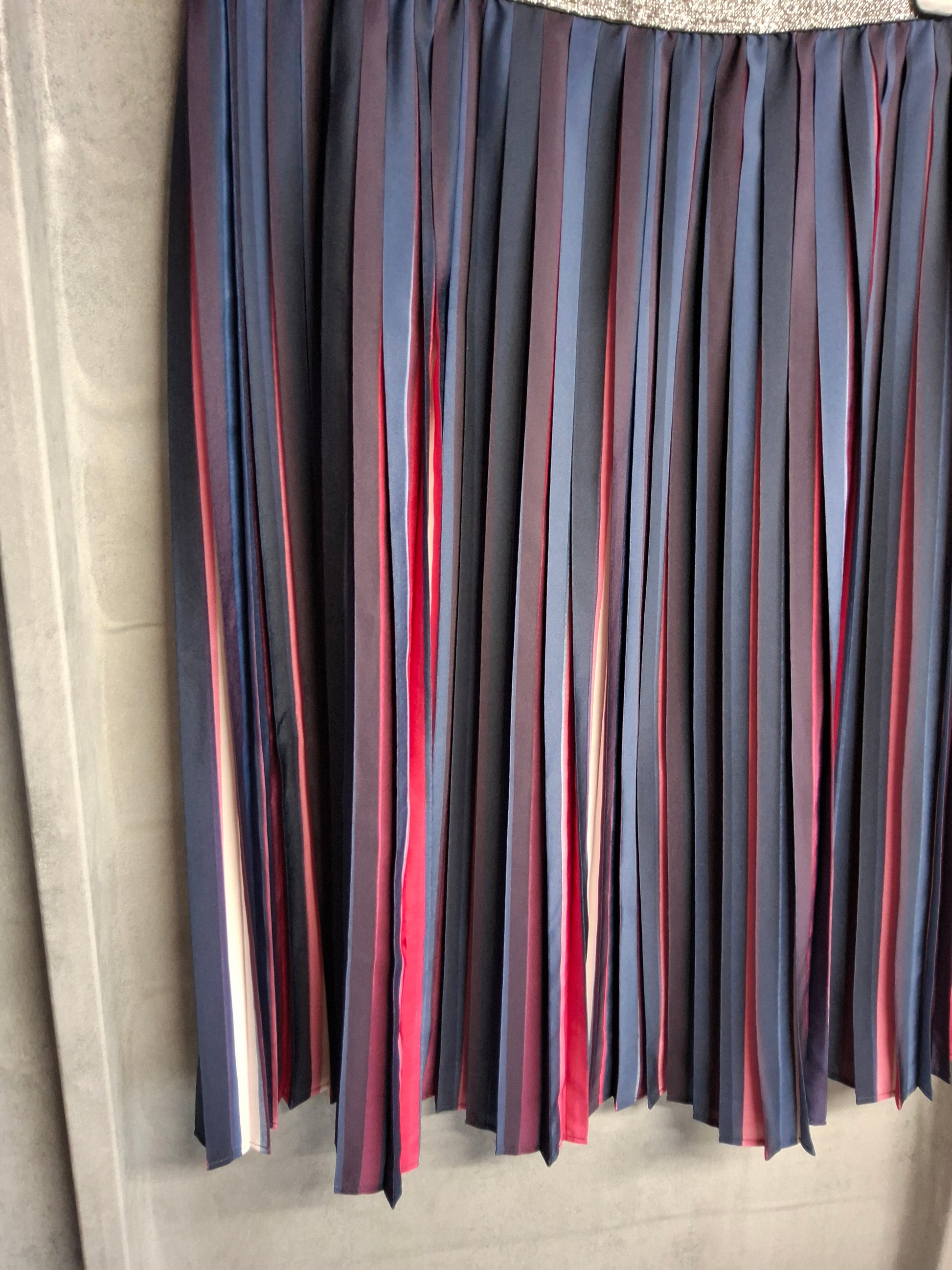 Colour: Blue with red & pink striped pleats