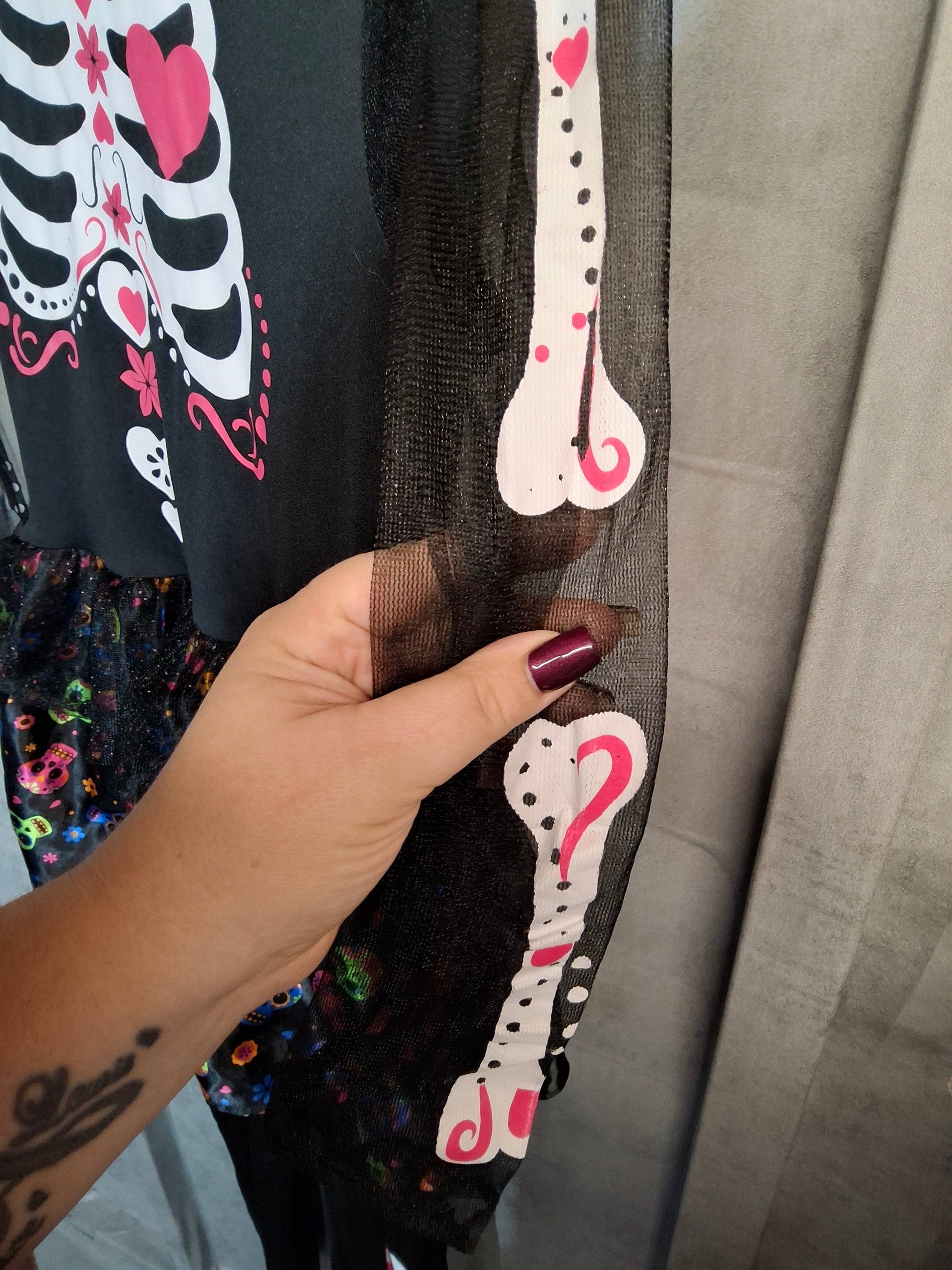 Perfect for trick-or-treating, discos or spooky parties – this skeleton costume is fun, colourful and ready for Halloween! Features printed skeleton bones, sugar skull patterned skirt and collar, and sheer sleeves. Note: some fading/marks on the sleeves (see pic), but still a great costume for dressing up.