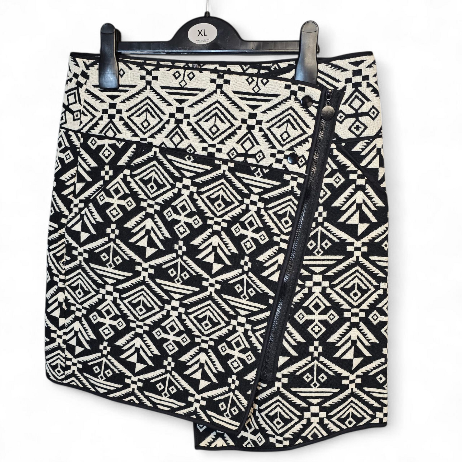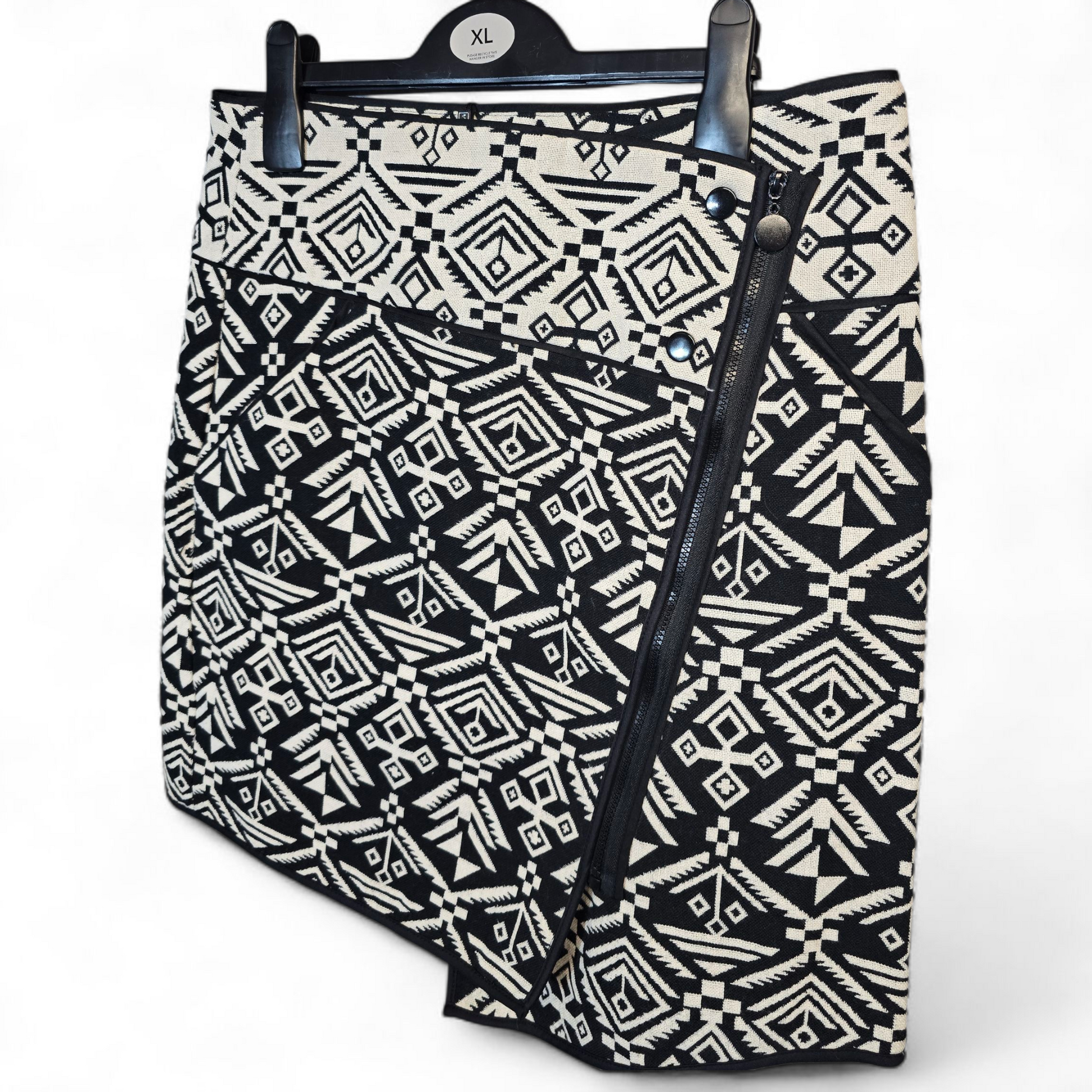A bold statement piece with a timeless edge! This For Cynthia mini skirt features an eye-catching cream and black Aztec pattern with a wrap-over zip and popper front design. Brand new with tags and super flattering — ideal for adding texture to your autumn/winter looks.