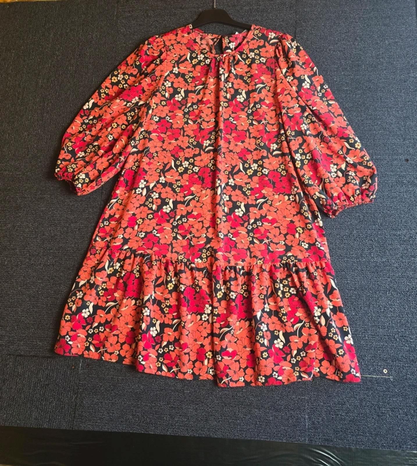 Preloved midi dress in red floral print on a black base, ideal for everyday, casual or work wear. Lightweight, floaty and easy to throw on while still looking put together. Clean, carefully checked, and ready to wear.