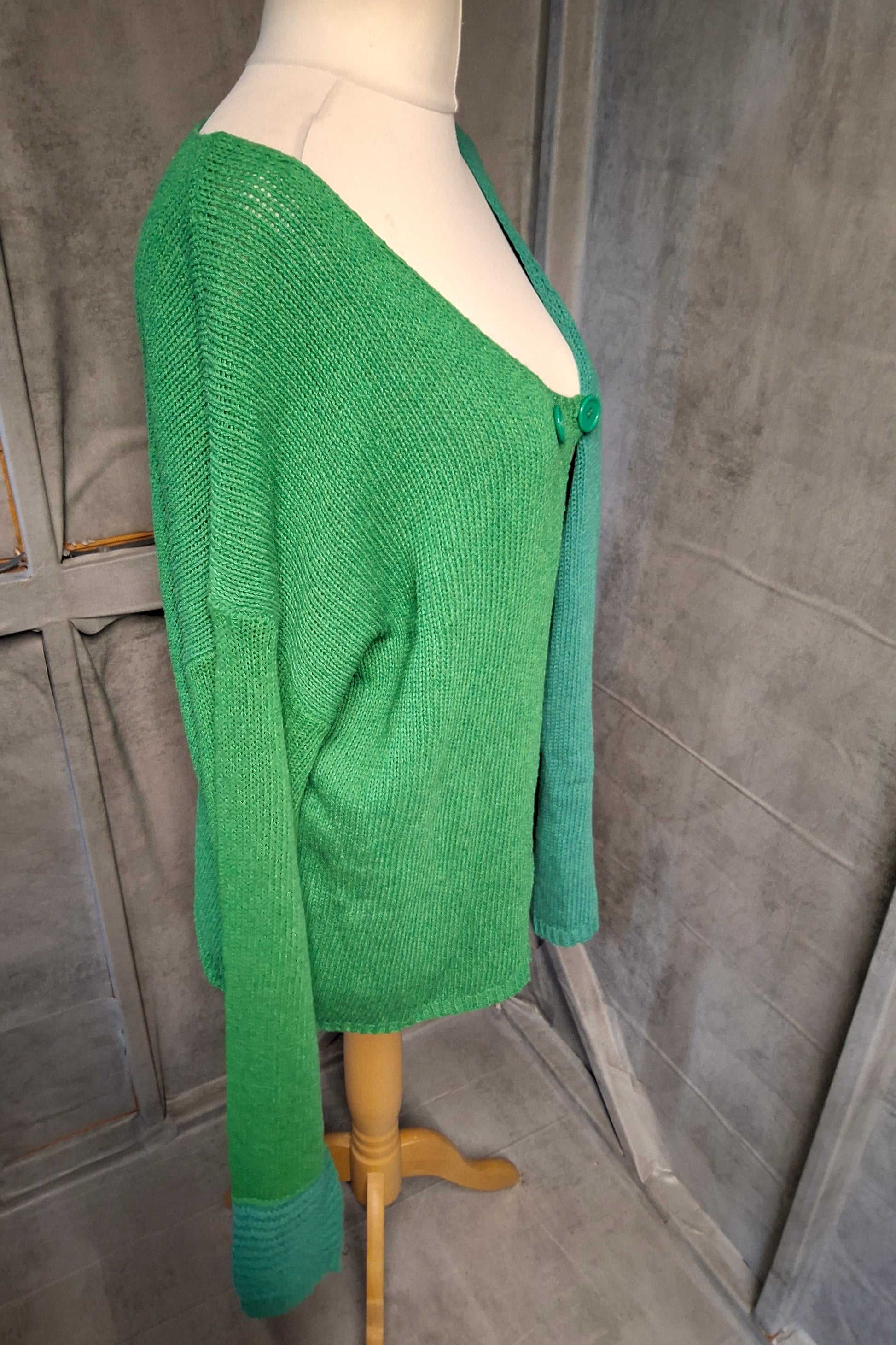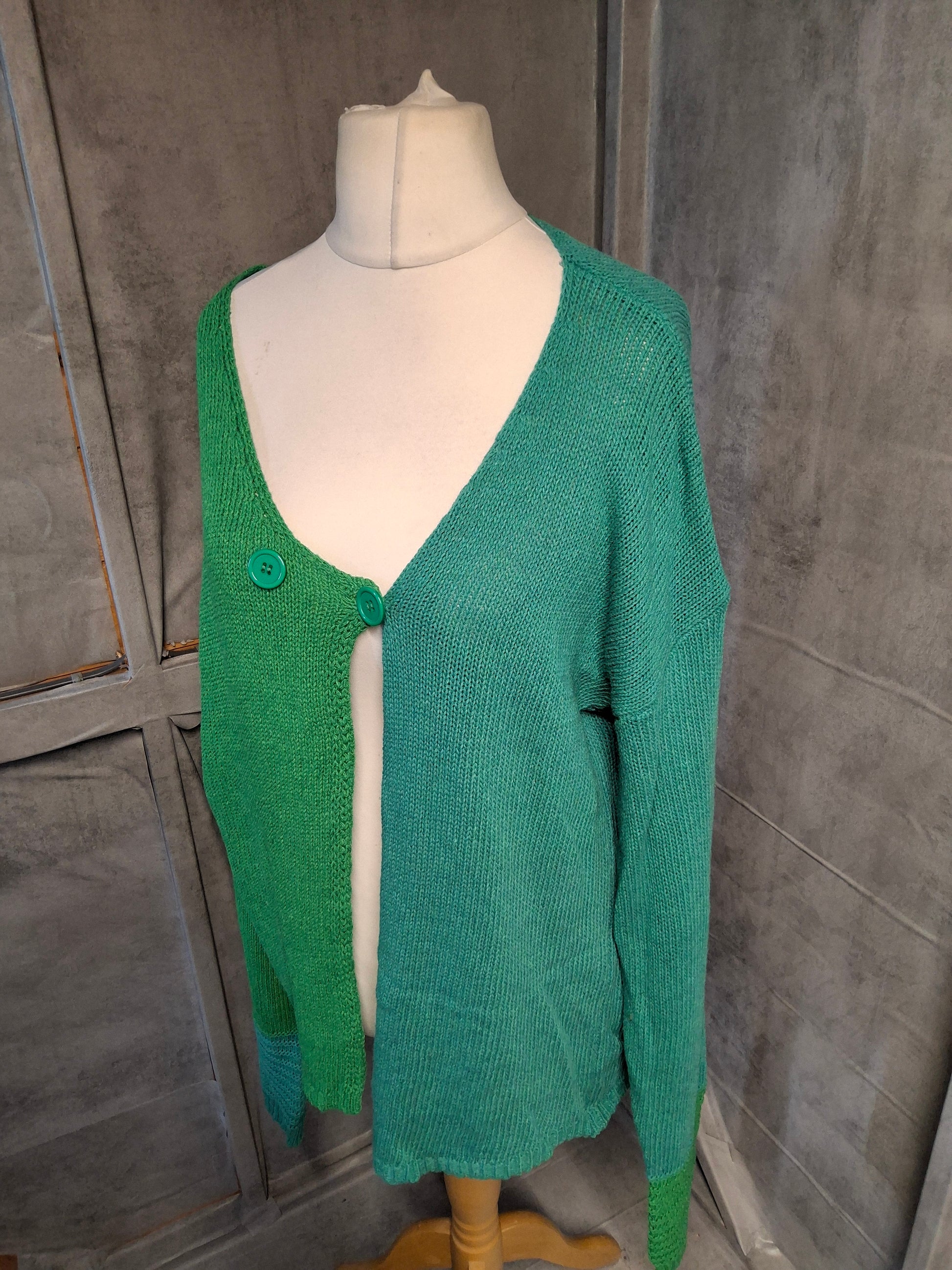 Bring on the cosy vibes with this handmade green colour block cardigan š Perfectly slouchy with its relaxed style, it fastens with two bold buttons at the front for an easy, throw-on layer. The mixed green tones give it a quirky edge while keeping it versatile enough for everyday wear.