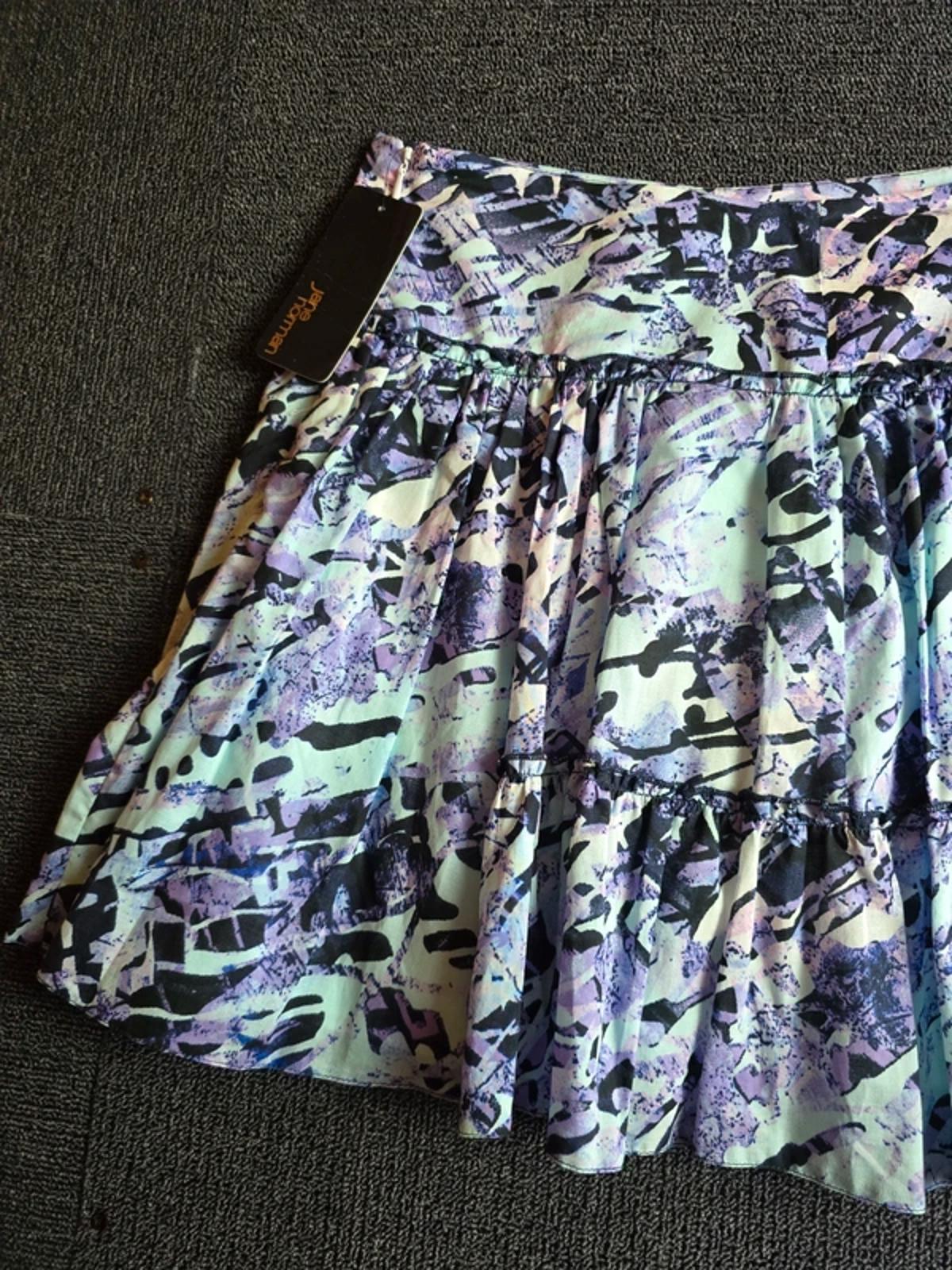 Preloved (new with tags) mini skirt in a purple and turquoise abstract print, ideal for casual wear, weekends or fun layering looks. Clean, carefully checked, and ready to wear.