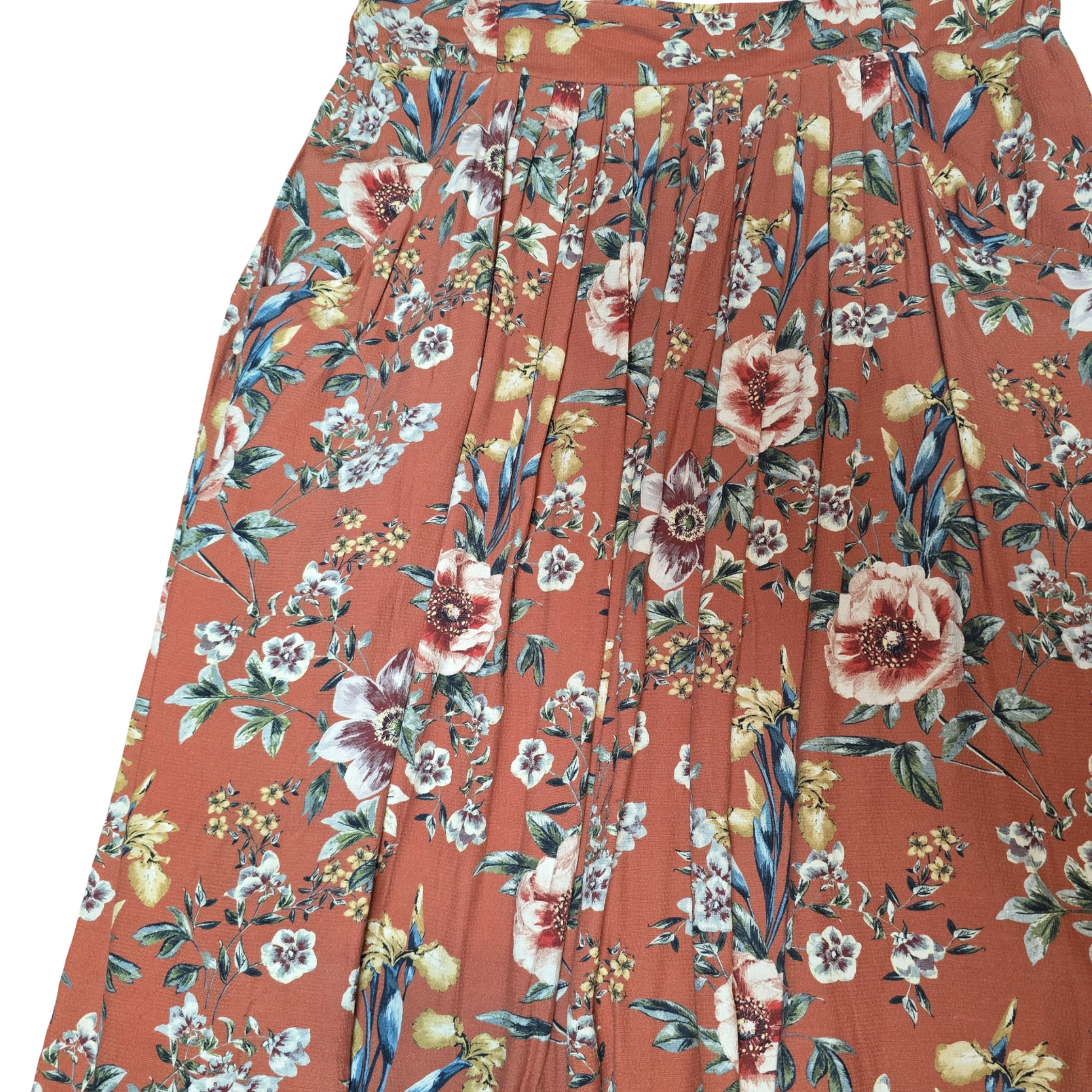 Laura Ashley Rust Floral Midi Skirt ā UK Size 8 ā Pockets + Pretty Vibes
