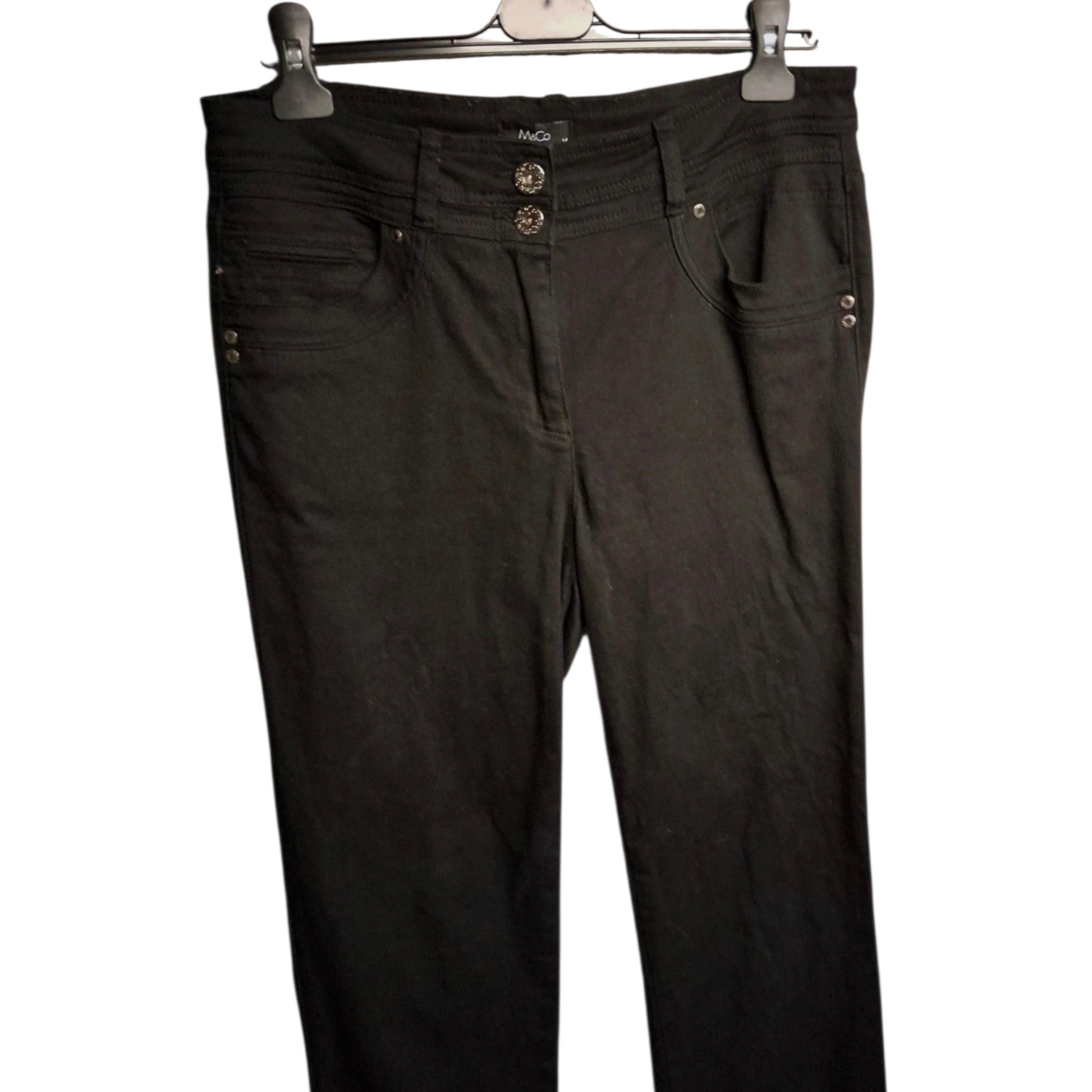 Your new go-to jeans π These M&Co black bootcut jeans in size 14 are high-waisted, comfy, and oh-so flattering. Designed with front and back pockets plus subtle stud detailing, theyβre the perfect blend of timeless and versatile β whether itβs casual days or dressing up with heels.