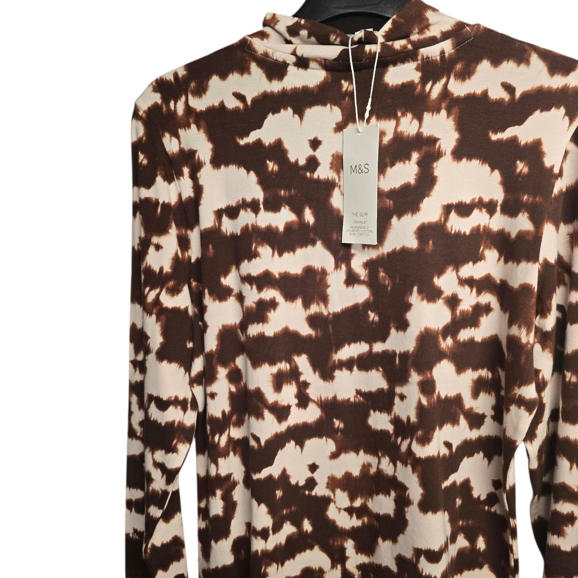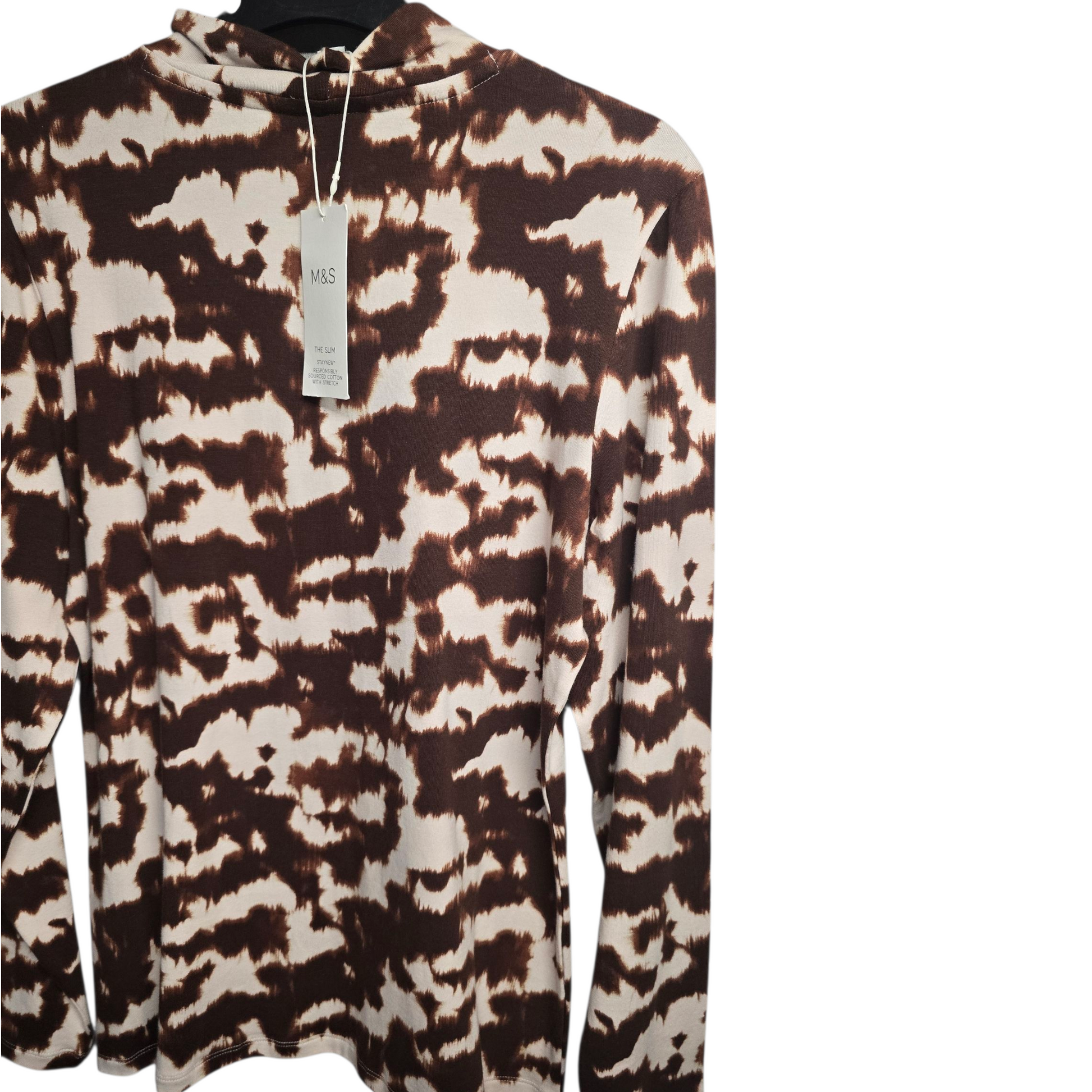 M&S Brown & White Animal Print High Neck Top – Size 14 – NWT – 95% Cotton