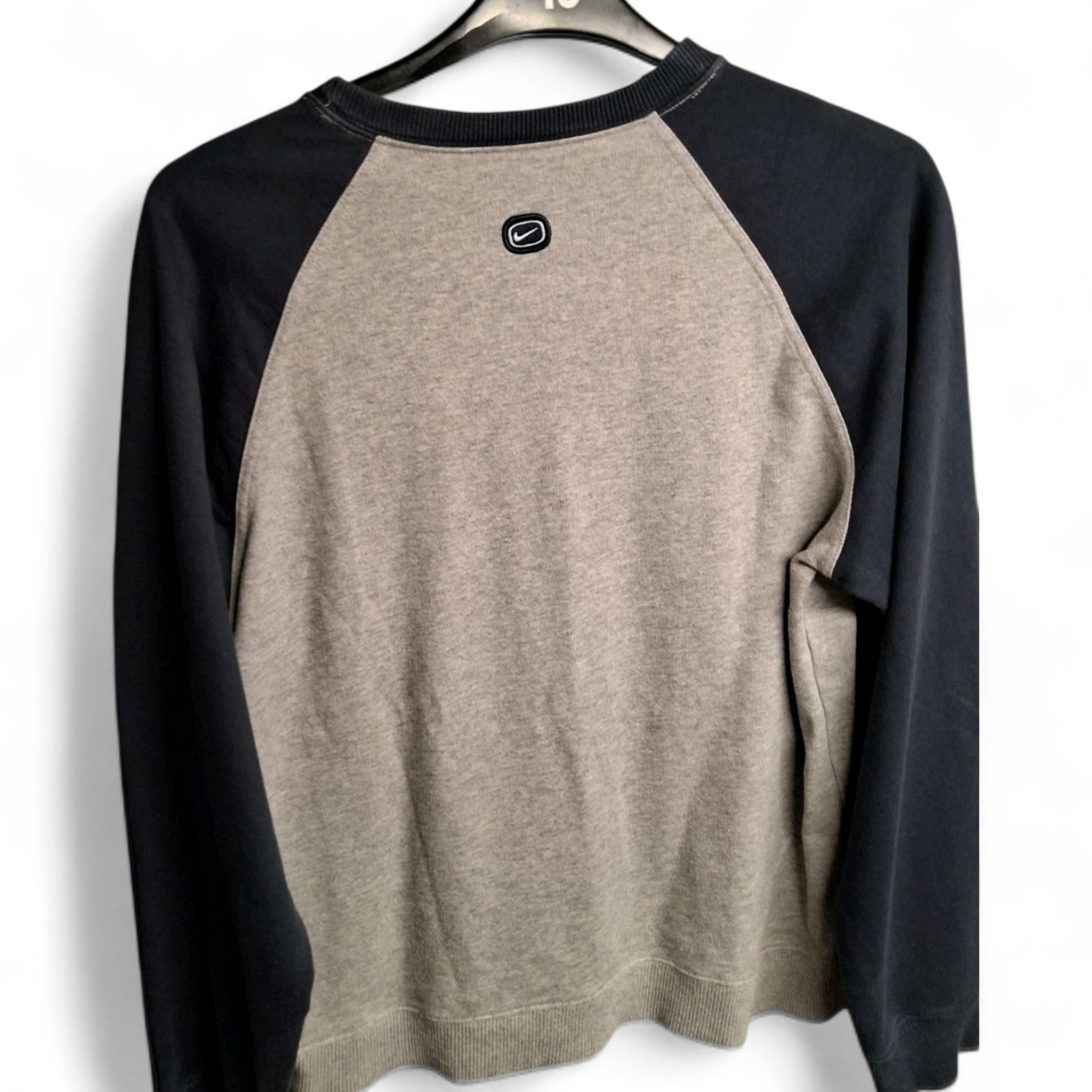 Men's Y2K Nike Grey & Navy Sweater – Small, Long Sleeve, Crew Neck, Logo Front, Sporty Retro Fit