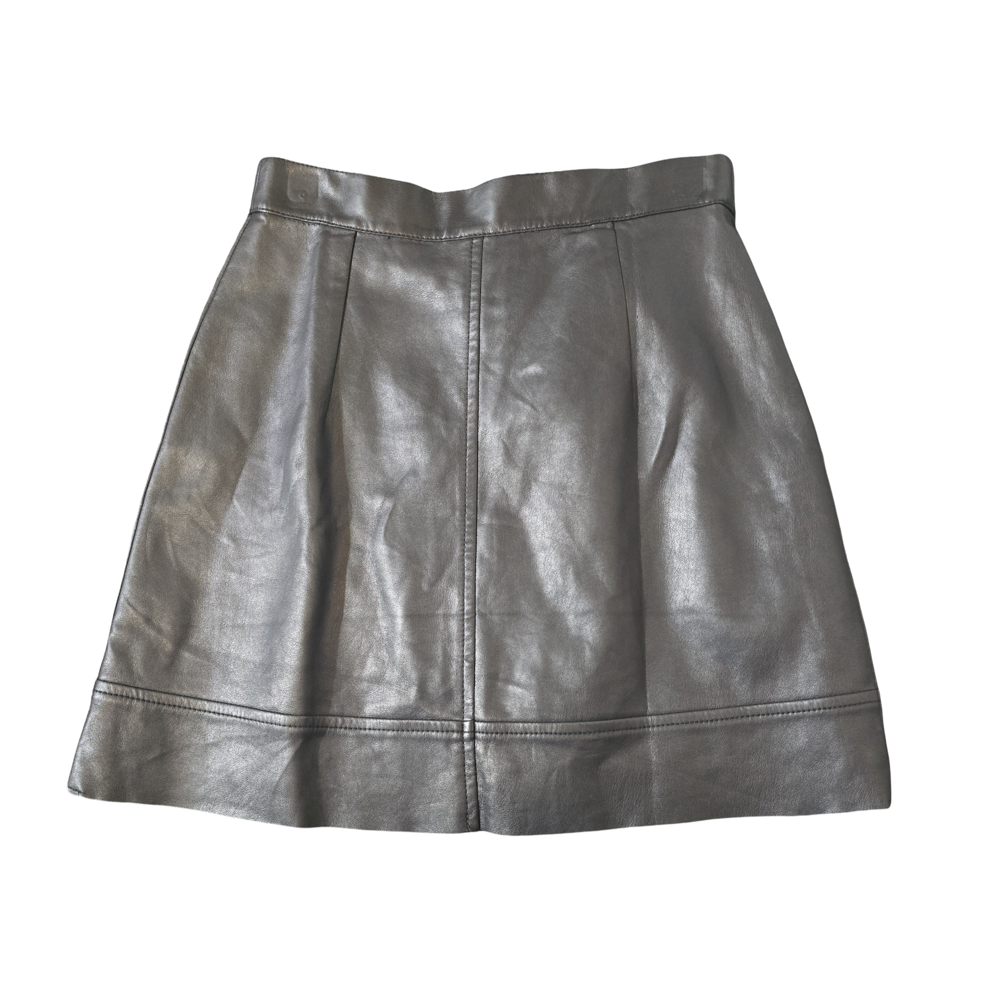 Style: Faux leather mini skirt, front pocket with zip & button detail