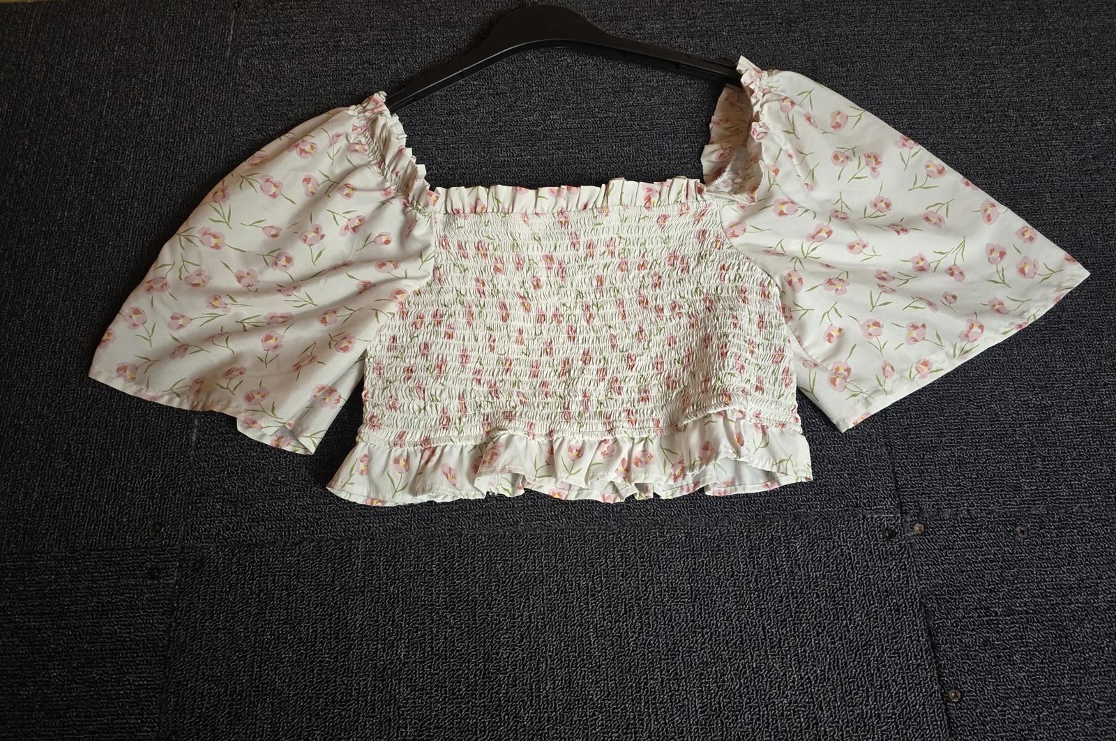Preloved crop top in a delicate white and pink floral print, ideal for summer, holidays, or festival wear. This feminine piece features a romantic, airy design that can be worn on or off the shoulder.