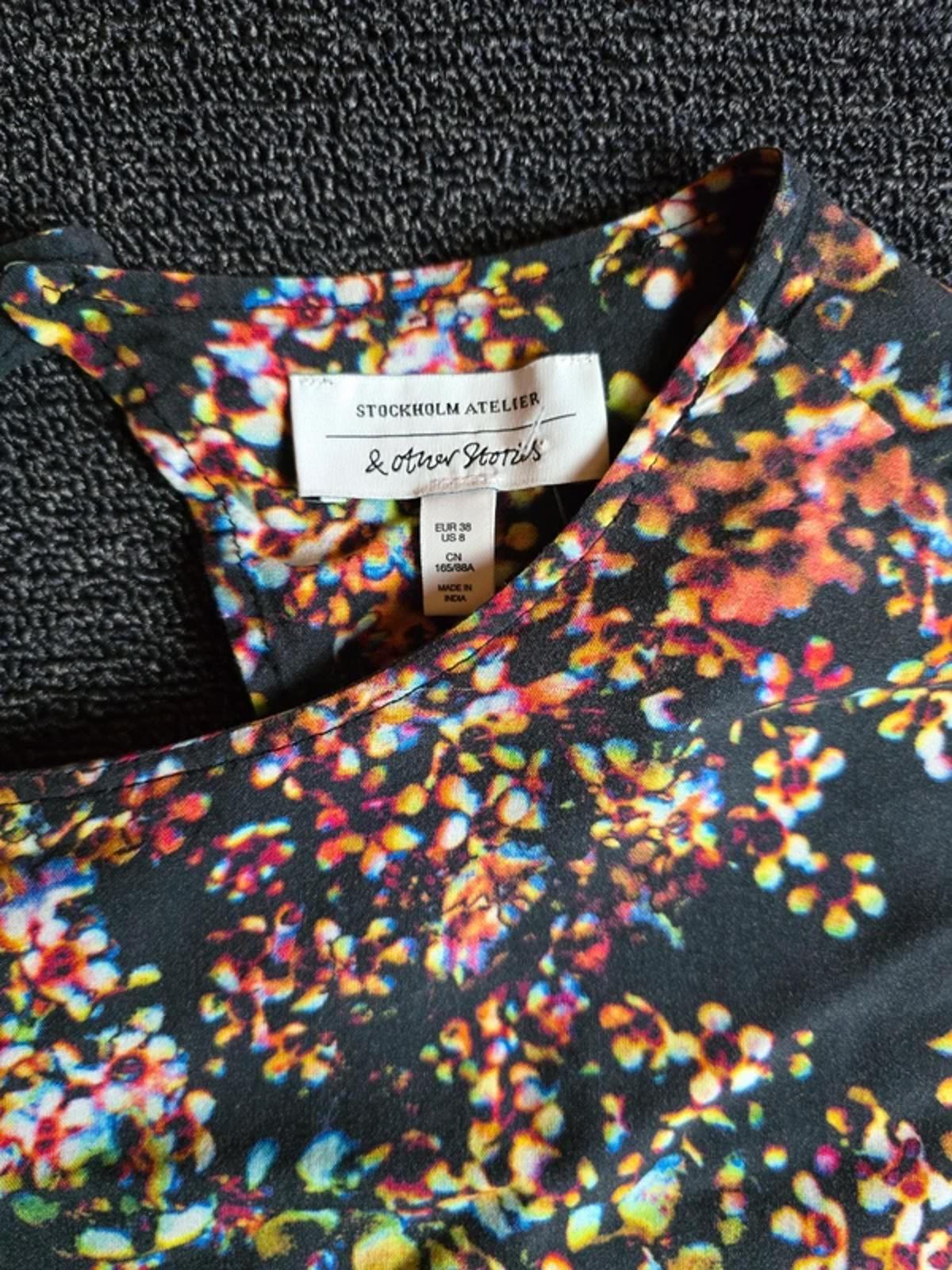 & Other Stories Black Floral Mini Dress UK Size 10 ¾ Sleeve Keyhole Back