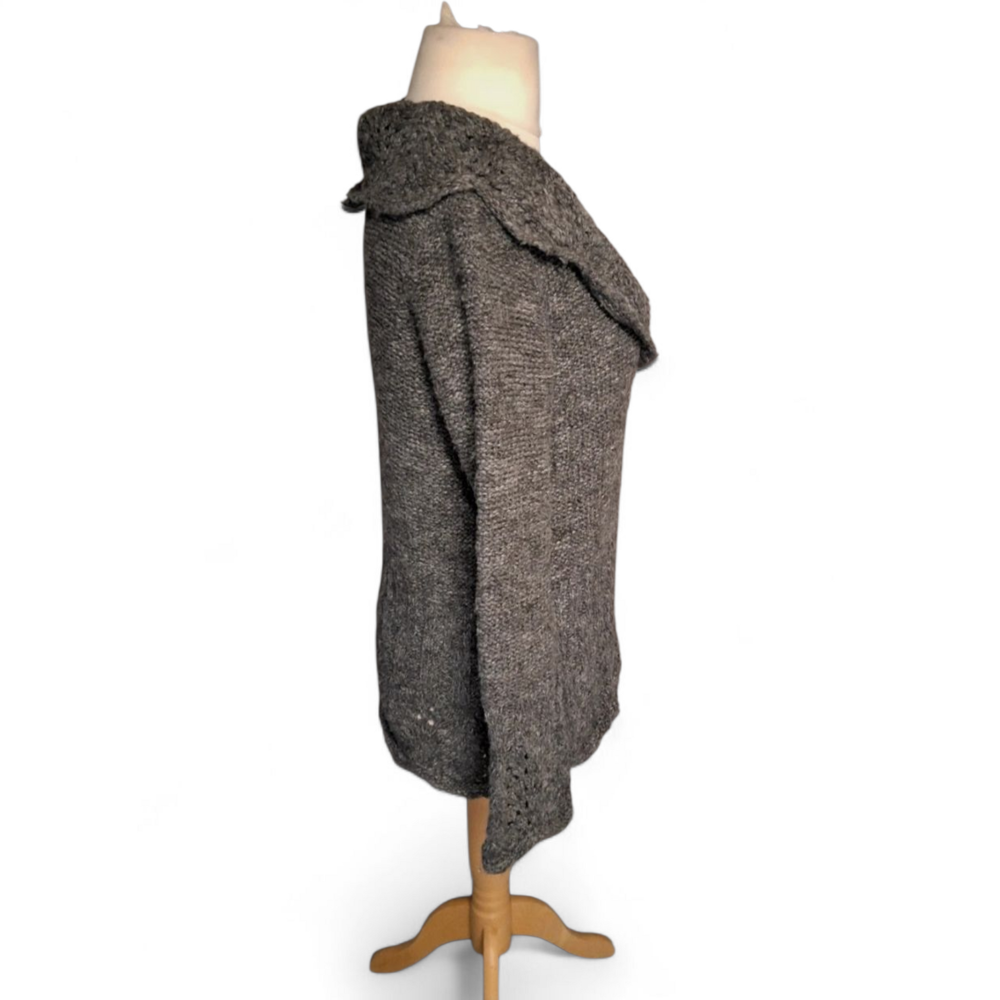 Cosy meets chic π§Ά β this Per Una grey knitted cardigan is the perfect throw-on for cooler days. Featuring a statement large collar, scalloped hem detailing, and a single button fastening for effortless layering. Warm yet lightweight, itβs an easy win for autumn/winter wardrobes.