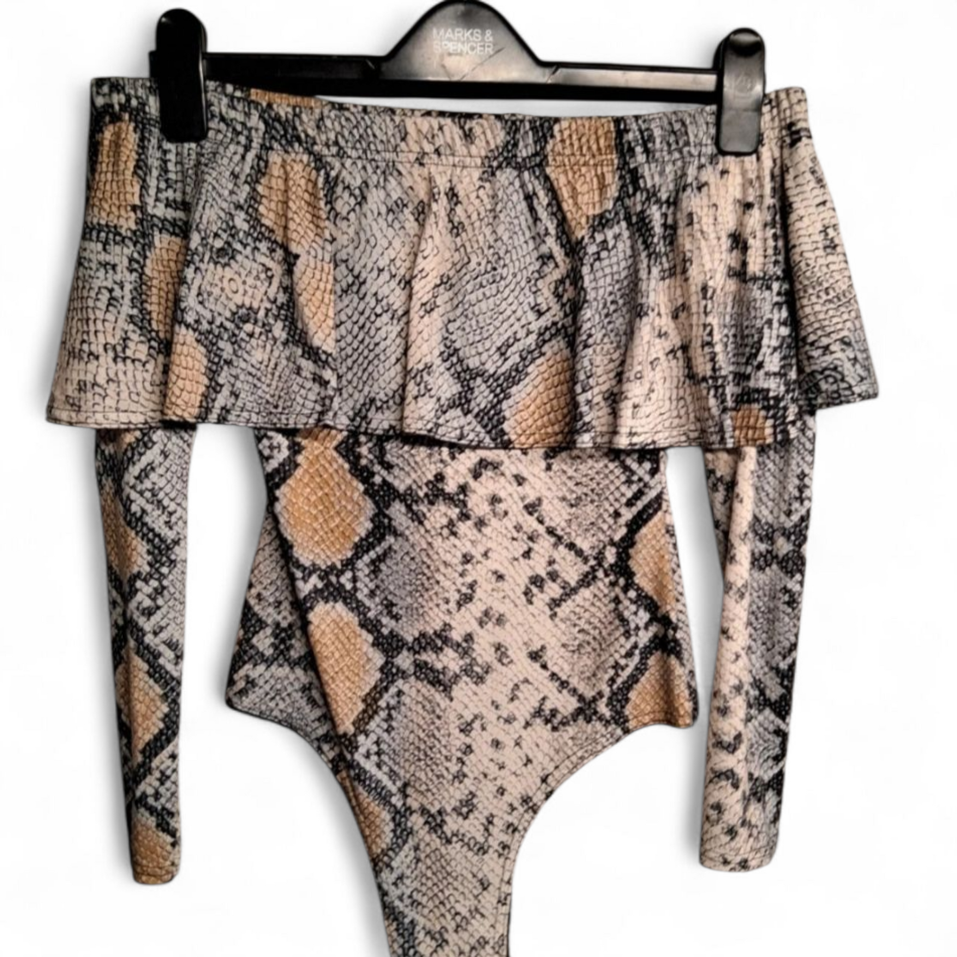 Warning: this bodysuit might bite ππ₯ Perfect for nights out where you want all eyes on you, this PrettyLittleThing snakeskin number brings the drama with its off-the-shoulder frill and long sleeves. The bodycon fit hugs in all the right places β just add high-waist jeans or a mini skirt and youβre ready to slay.