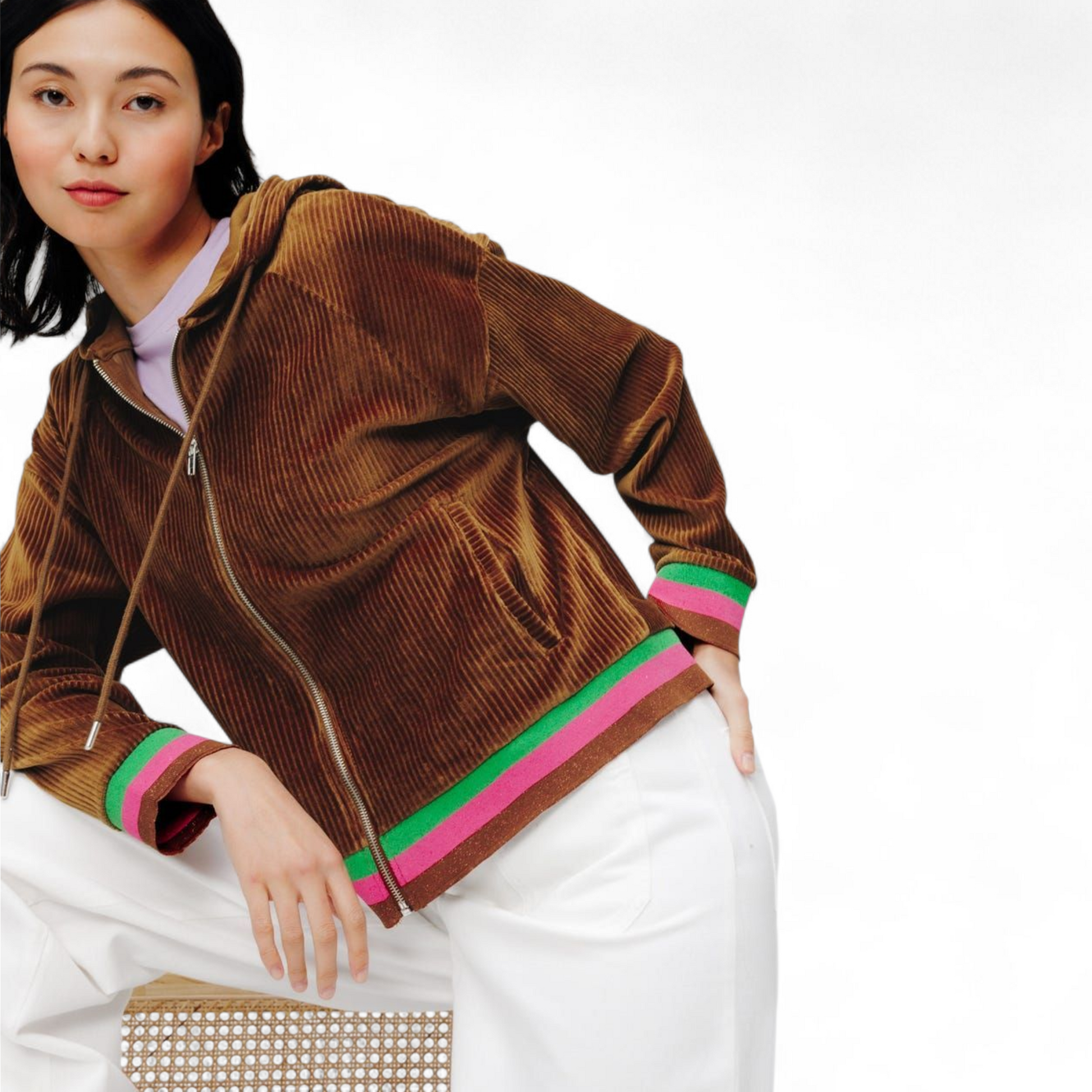 Retro vibes with a cosy twist ✨ This Promod corduroy zip-up hoodie comes in rich brown with a striped glitter hem for a pop of colour. Complete with a drawstring hood, pockets, and comfy elasticated trim – it’s casual but with a fun finish.