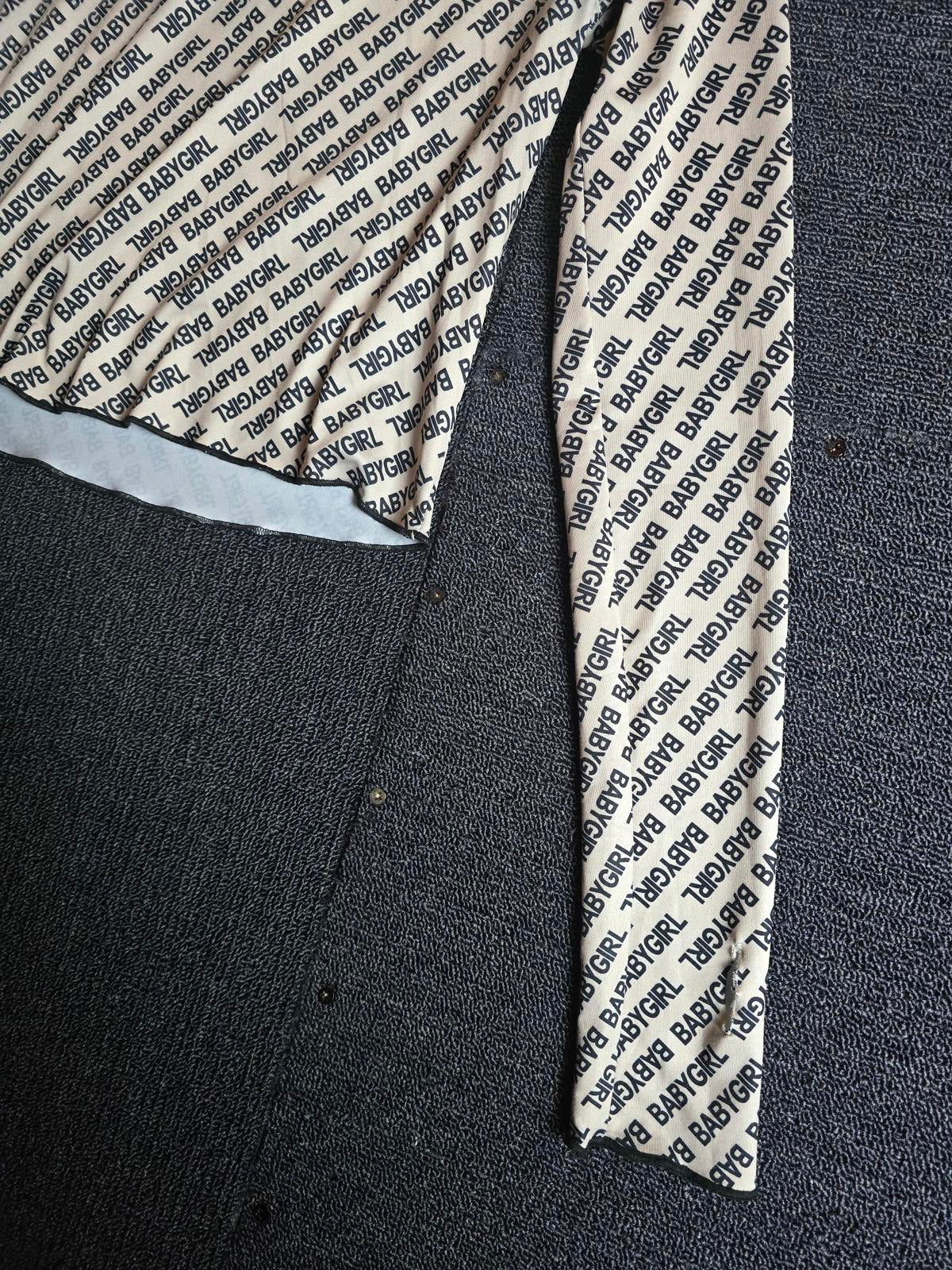 Style / Fit: Bodycon fit, cropped length, high neck, long sleeves with thumb holes, all-over “Baby Girl” print