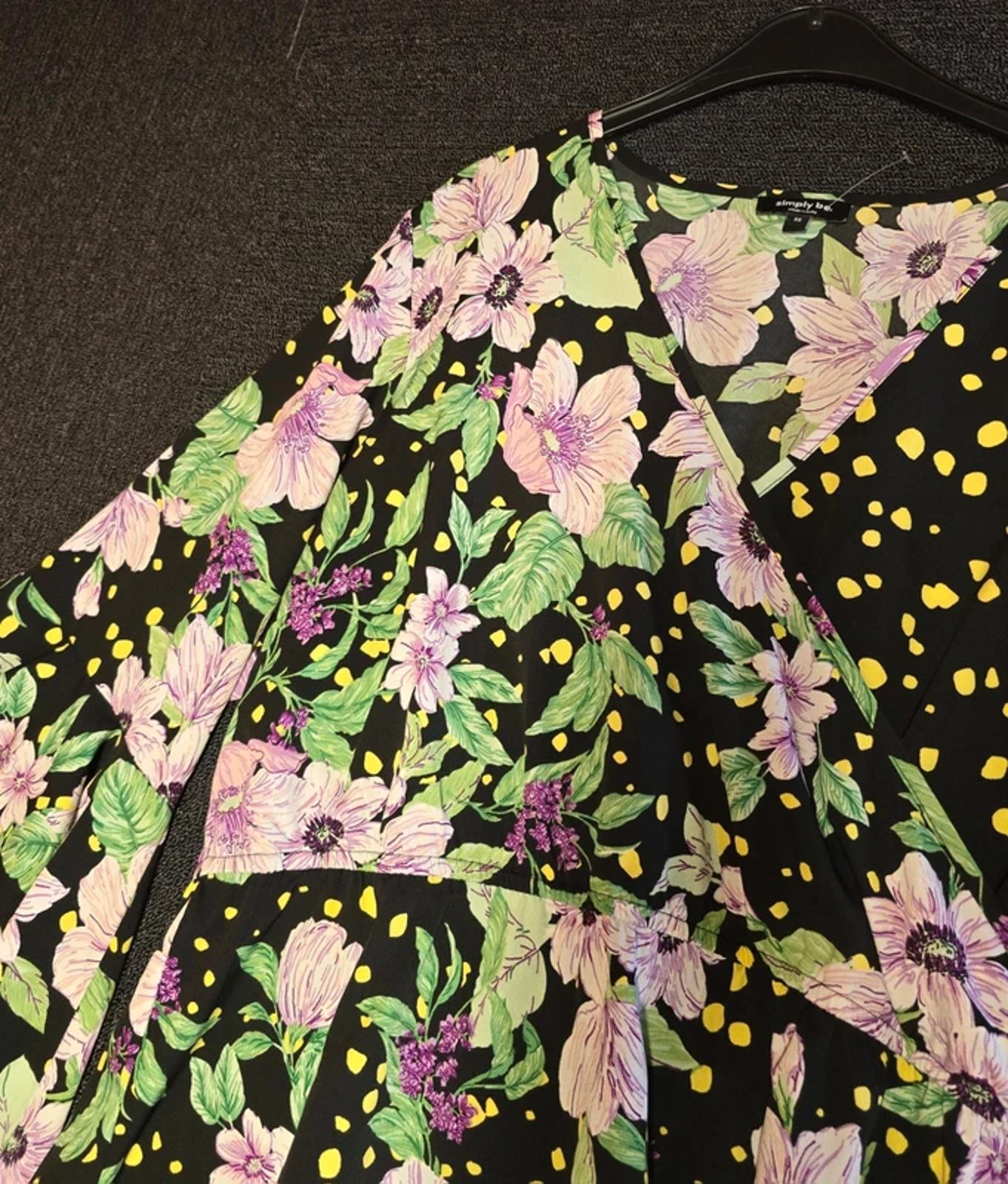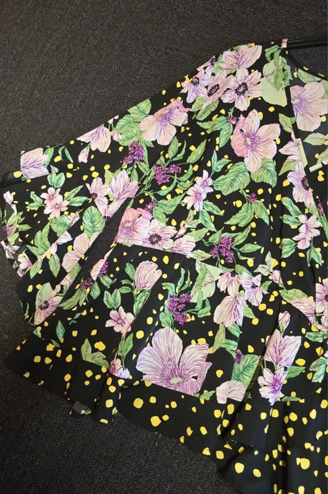 Style / Fit: Floral & polka dot print, 3/4 flared sleeves, wrap front