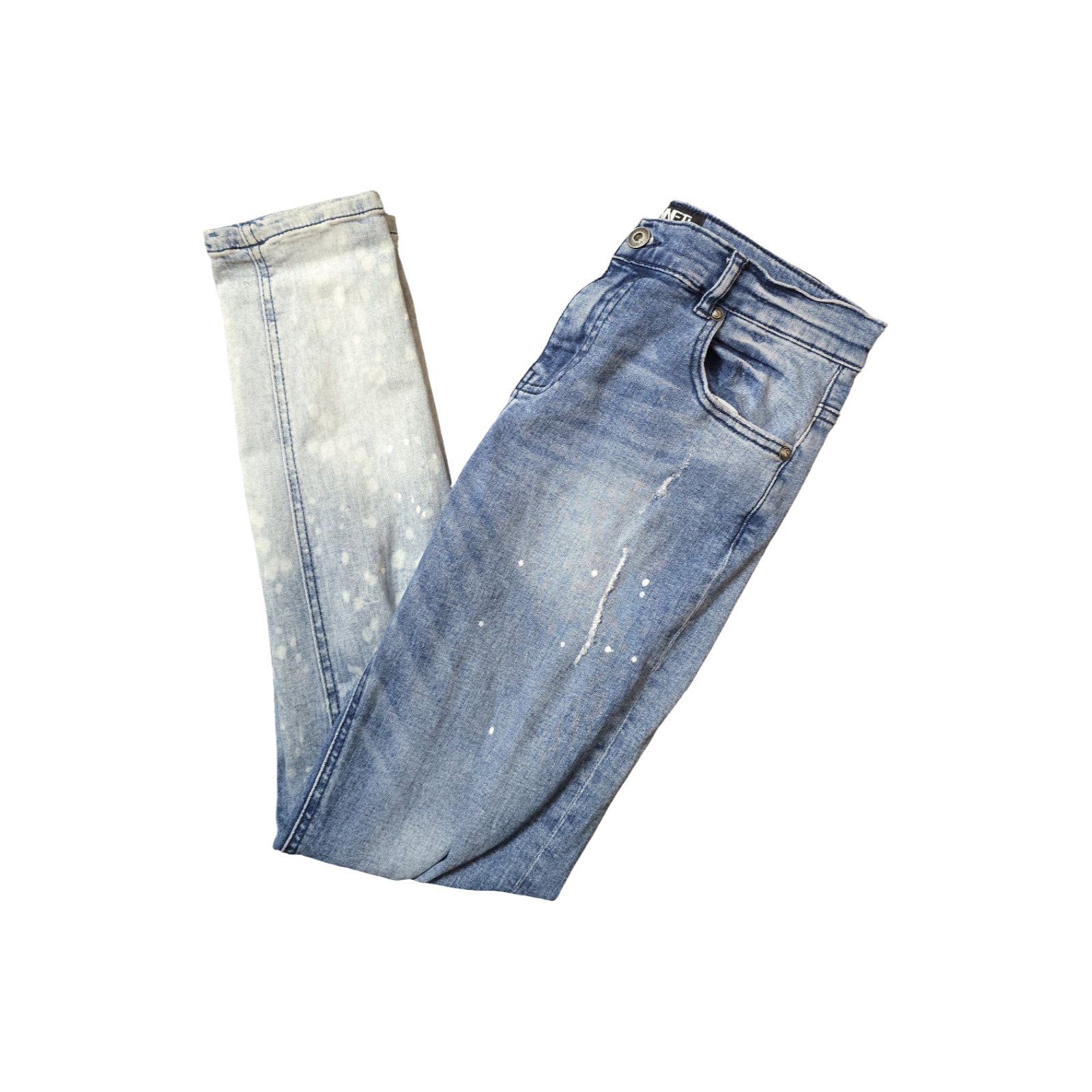 Style: Skinny fit, ripped knees, paint-splash effect