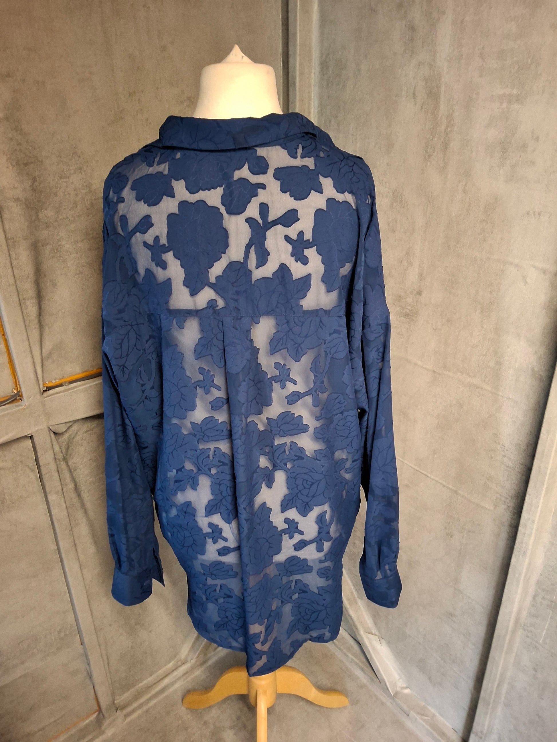Soon Navy Sheer Floral Blouse – Size 16 – Long Sleeve, Relaxed Fit, High-Low Hem