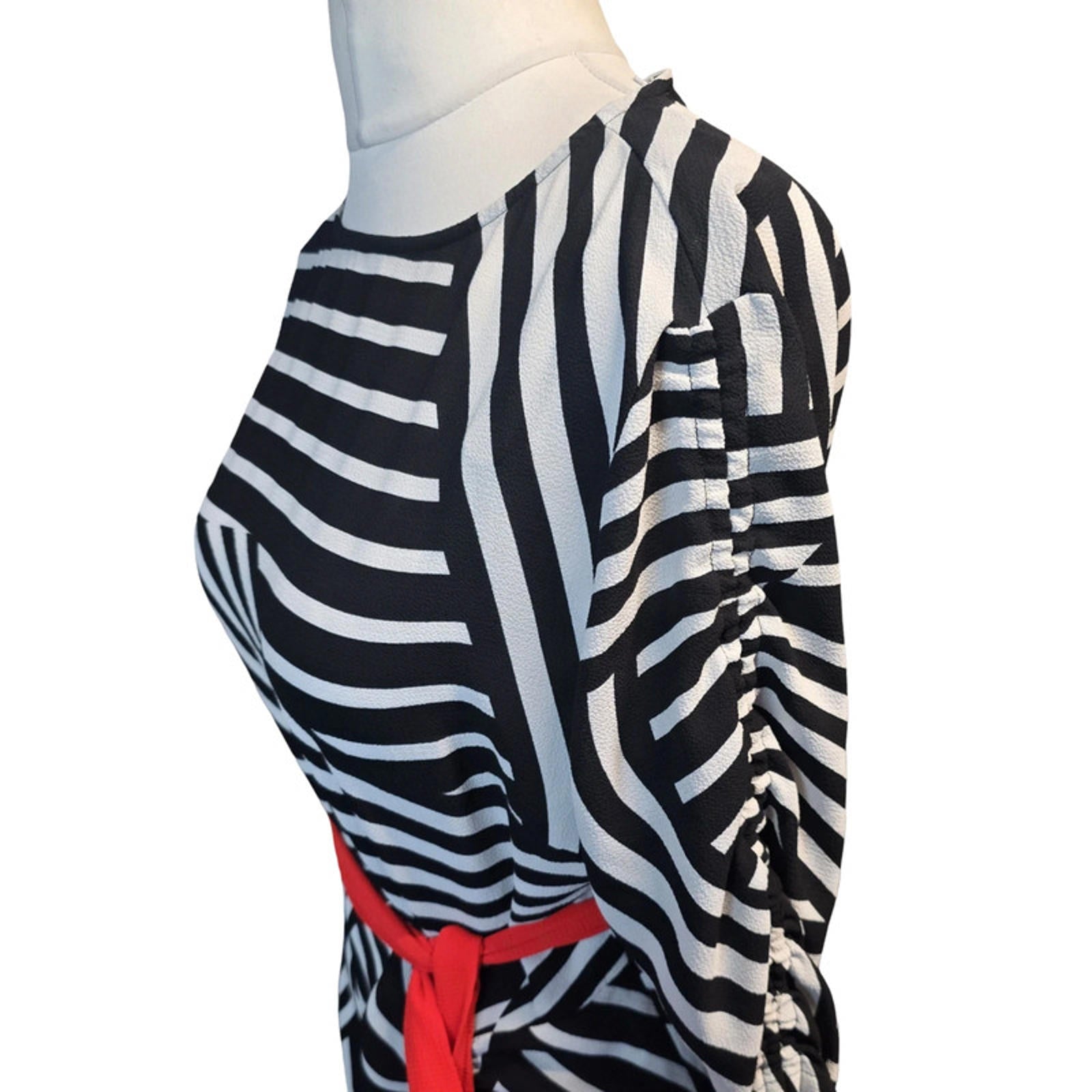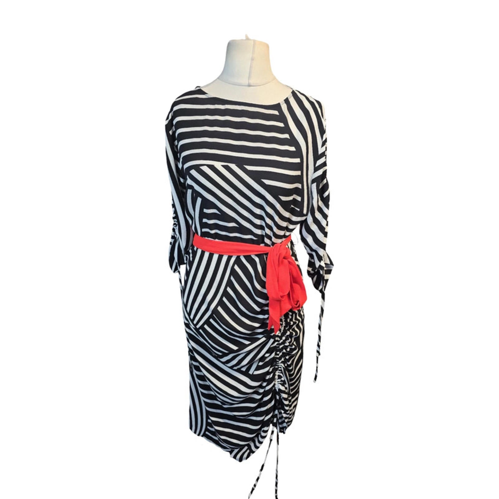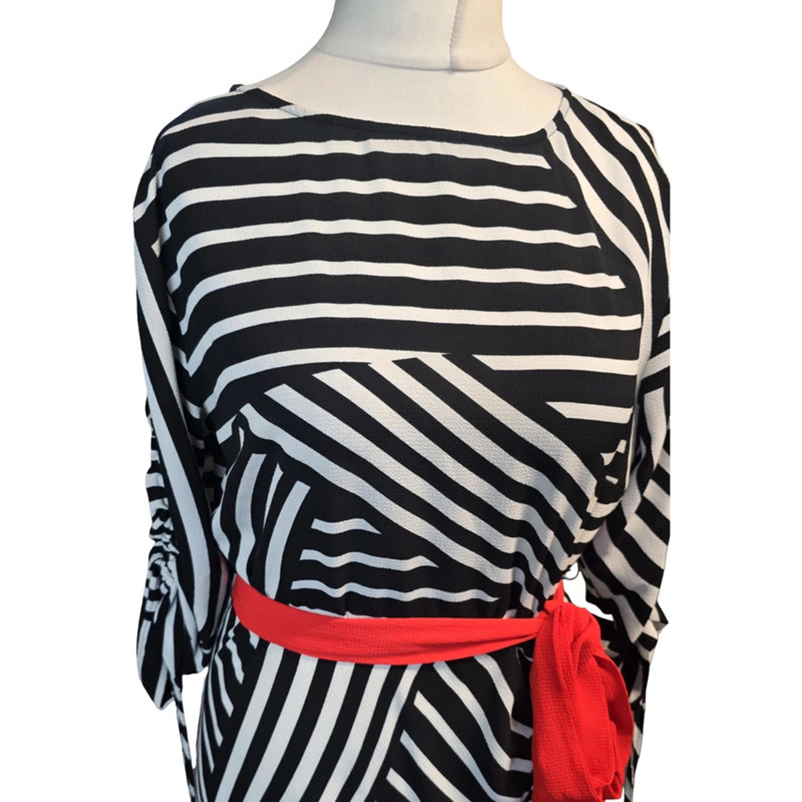 Studio by Preen Stripe Midi Dress Black White Size 12 Ruched Detail & Red Belt
