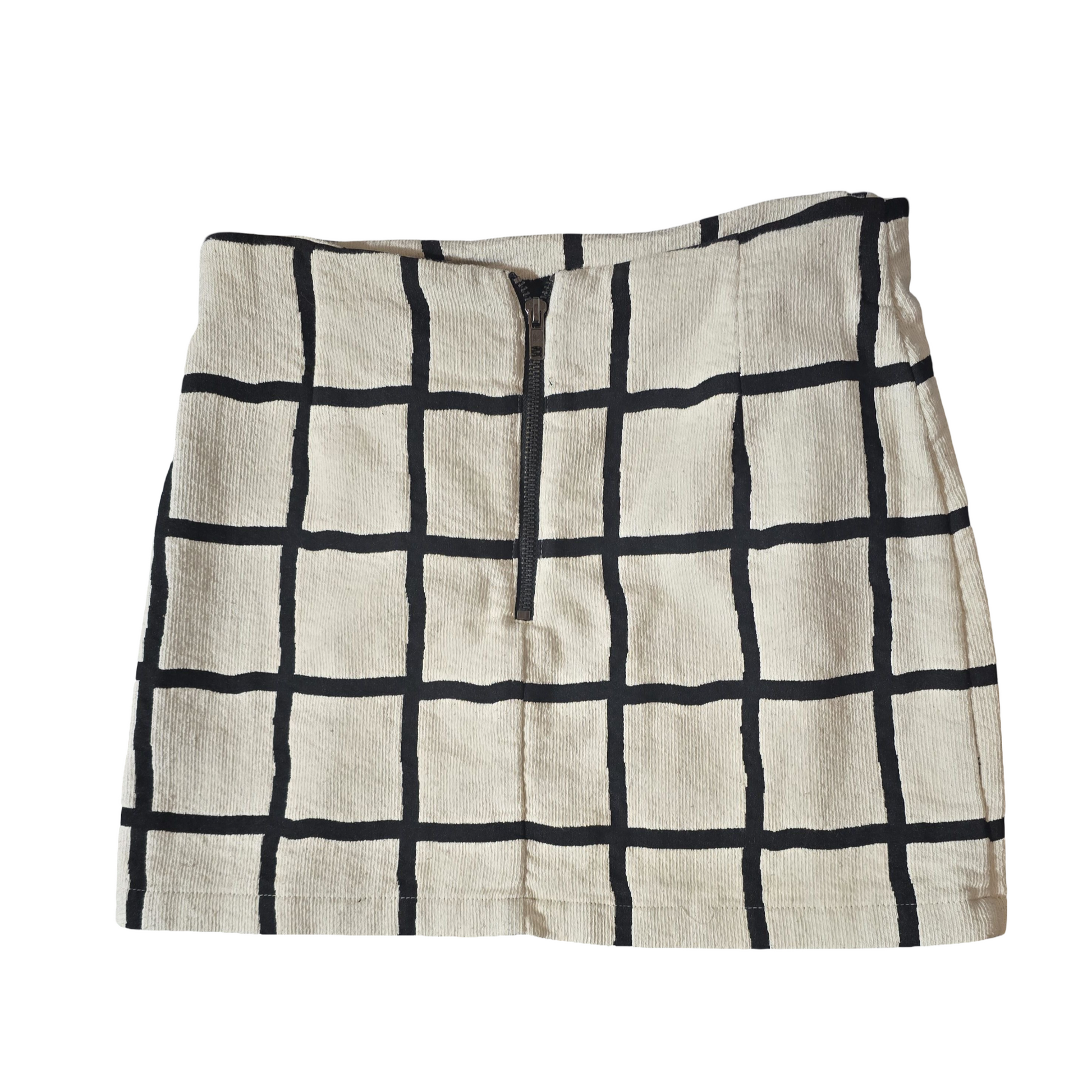 Designed in a bold black grid print on an off-white base, this mini skirt is made from a cotton and polyester blend with a structured feel. Features zip detail on the back and front for extra edge. Unlined and lightweight ā perfect for styling up or down. A few small bobbles (see pics), but plenty of wear left!