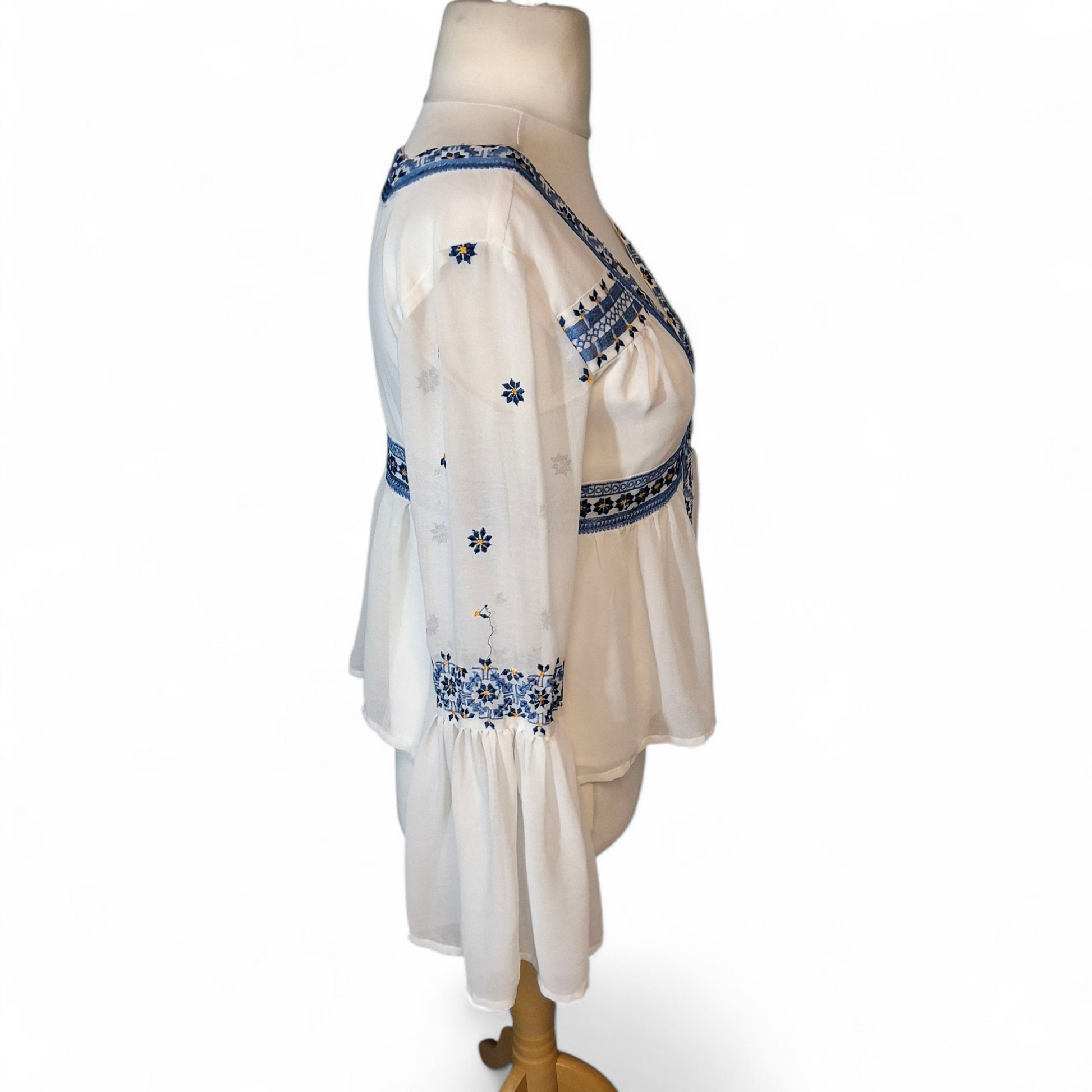 Topshop White & Blue Embroidered Top ā Size 10 ā Sheer Flared Sleeves