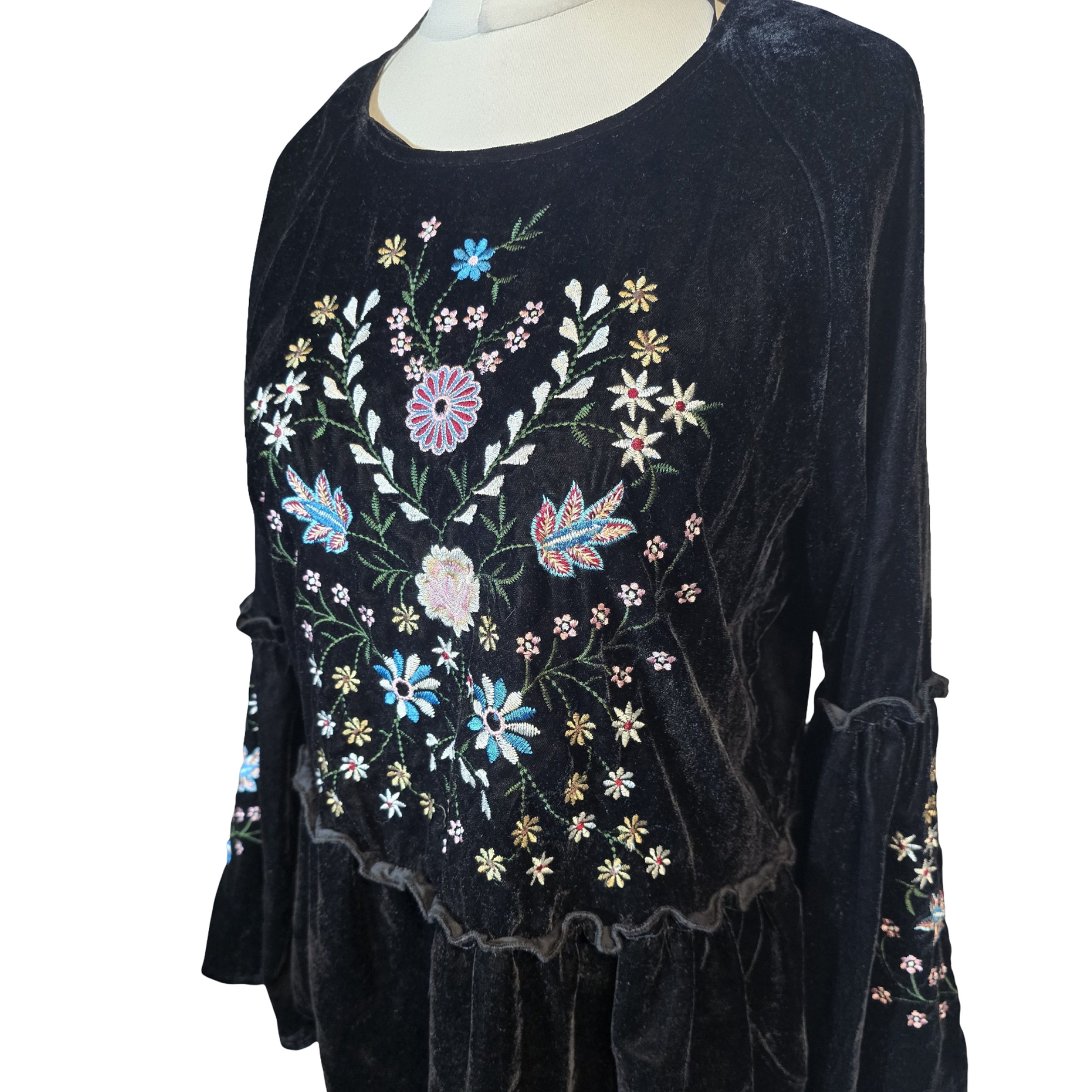 Tu Black Velvet Floral Embroidered Peplum Blouse – Size 12