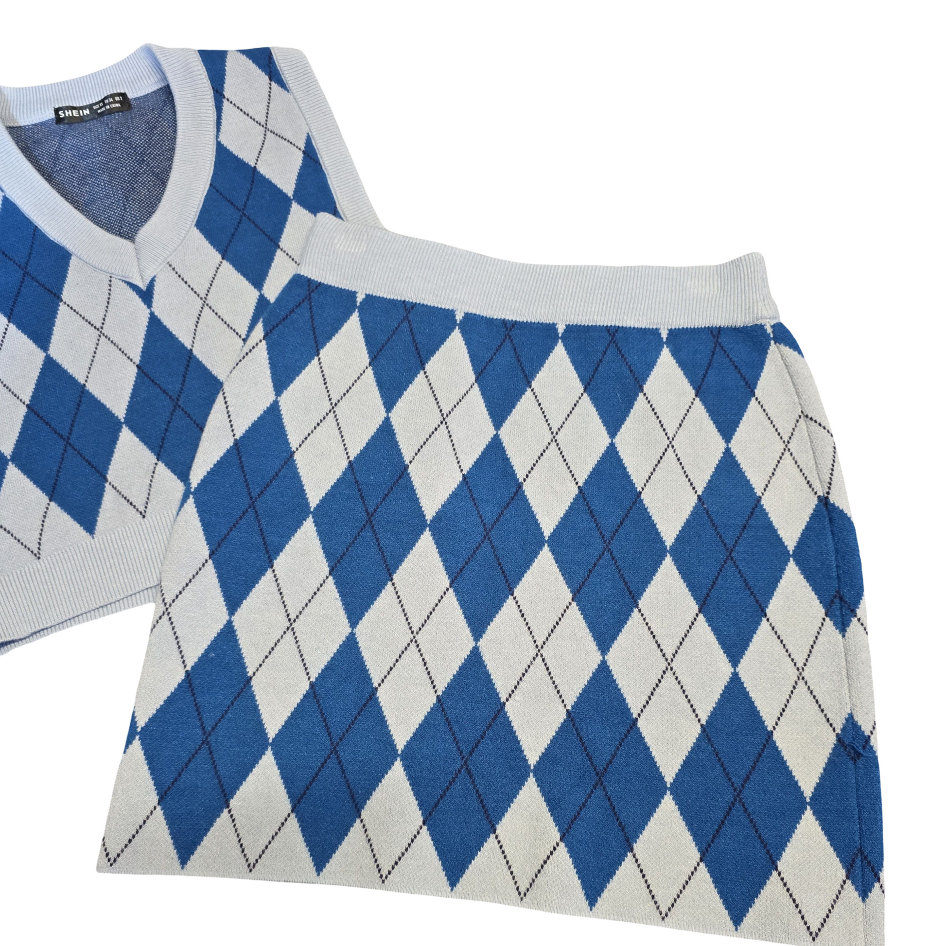 Preppy vibes never looked so good šš¤. This Shein 2 piece set features a cropped sleeveless tank top and matching mini skirt in a bold blue & white argyle knit design. Super cute and on-trend ā perfect for teens or petite sizes.