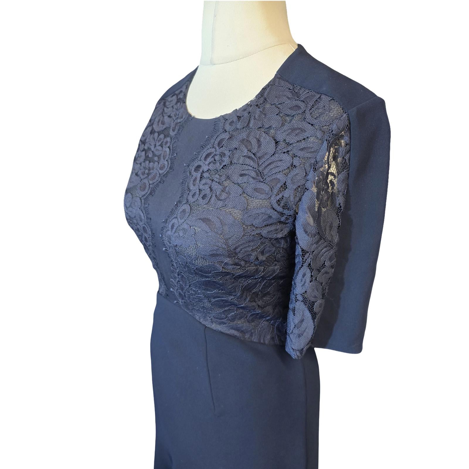 When elegance meets effortlessness 💙 This Whistles navy midi dress features beautiful lace panelling on the bodice and sleeves with a flattering fit & flare silhouette. Perfect for weddings, parties, or smart work occasions.
