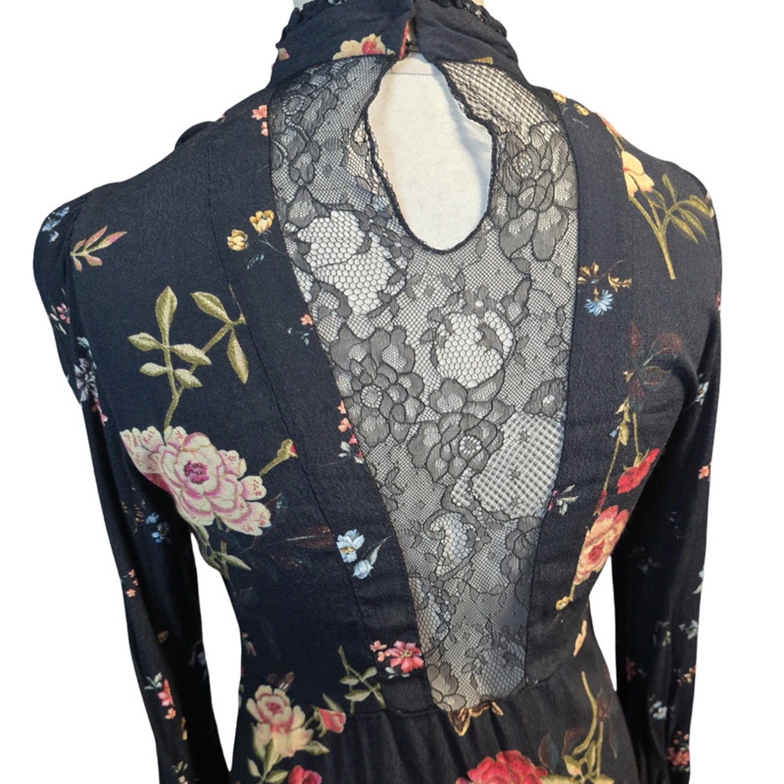 Zara Black Floral Mini Dress L UK Size 12 Long Sleeve Lace Back Frill Detail